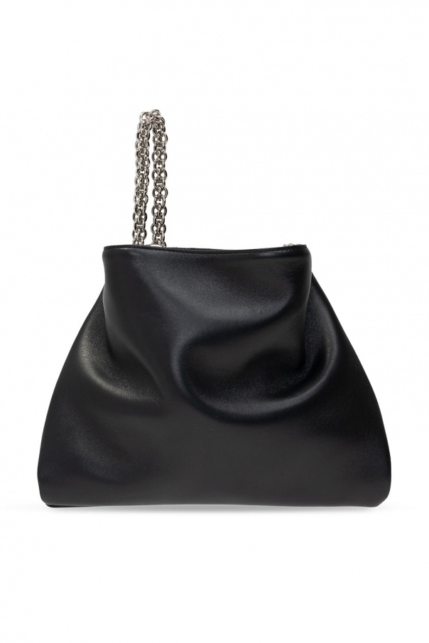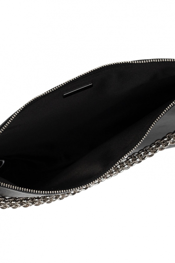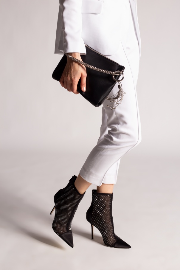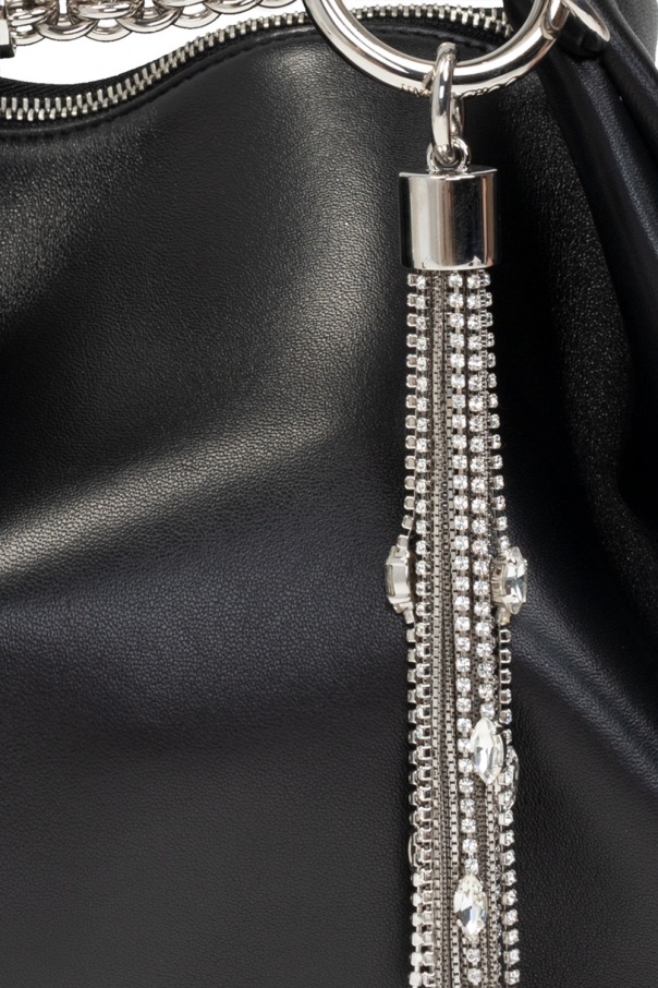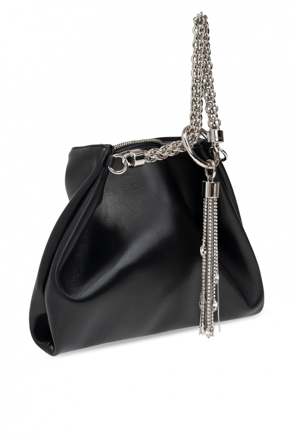 Black 'Callie' handbag from Jimmy Choo. Crafted from leather, this item secures with a zip fastening accentuated with chain. It is complete with silver-tone metal hardware and a blush pink clad interior with one compartment.