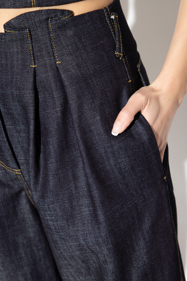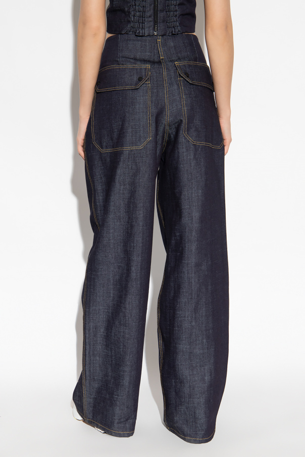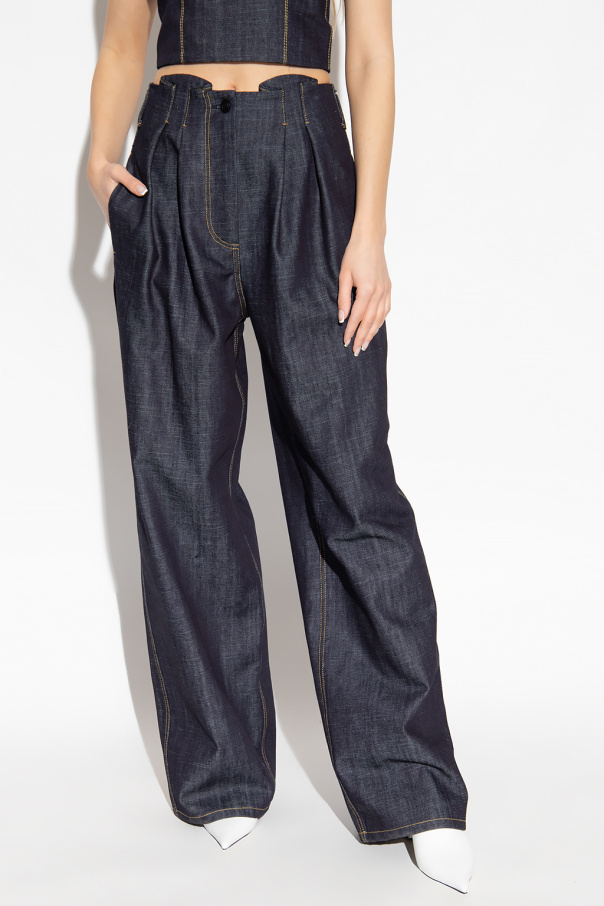 Navy ‘Aspos’ jeans from The Mannei. Fastened with a zip and button, this wide leg pair features decorative pleat details, two front pockets, two snap-fastened flap pockets at the back and wide legs.