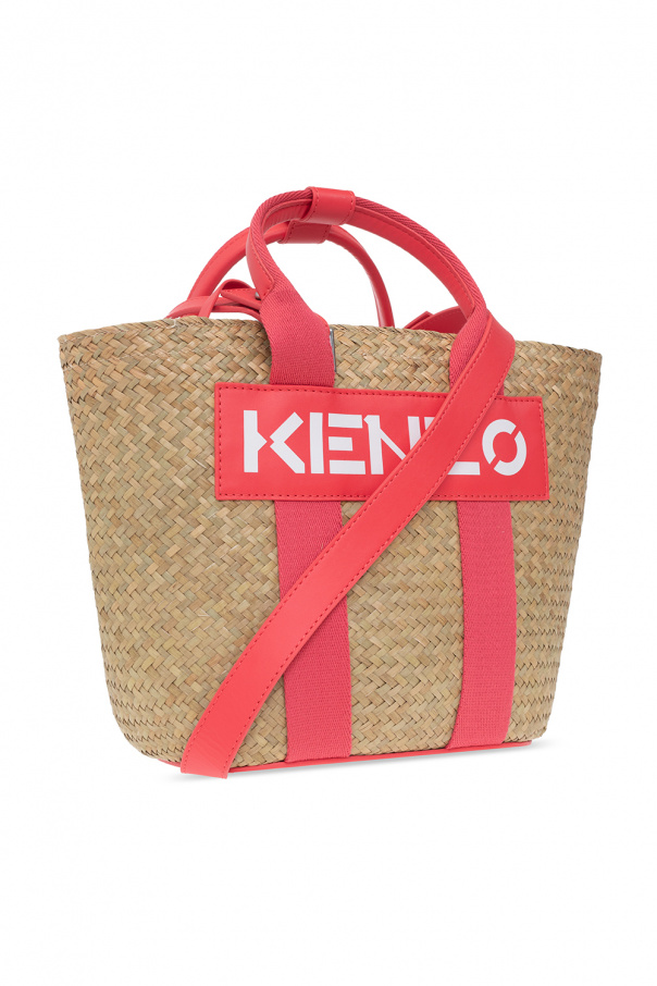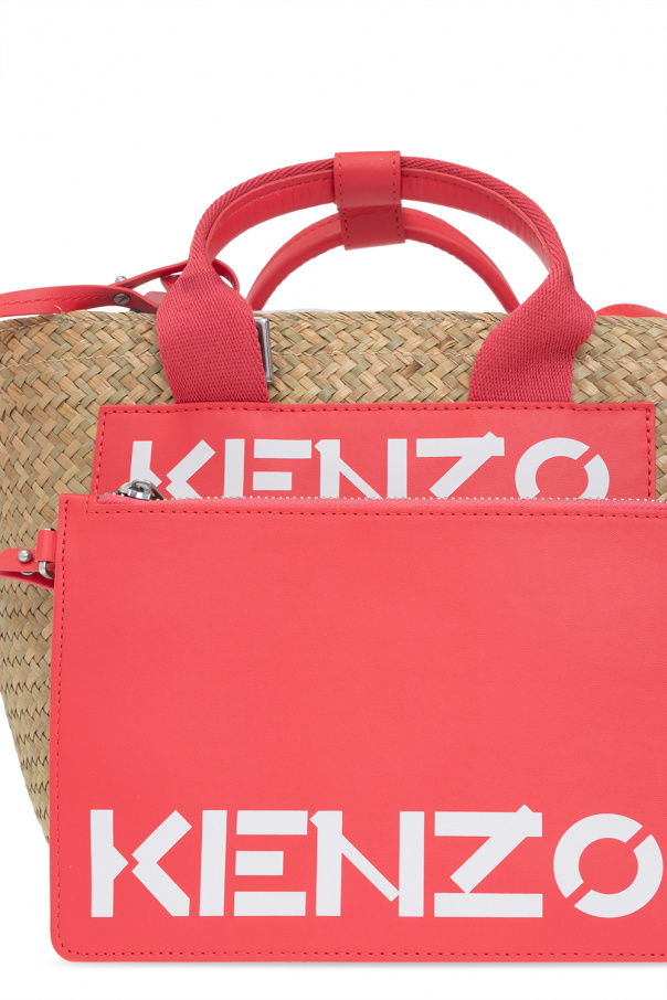 Beige and pink shopper bag from Kenzo, size small. Woven from raffia with fabric trims, this design features a white logo print, two half-round handles, two half-round shoulder straps and one internal compartment with a detachable zipped pouch.