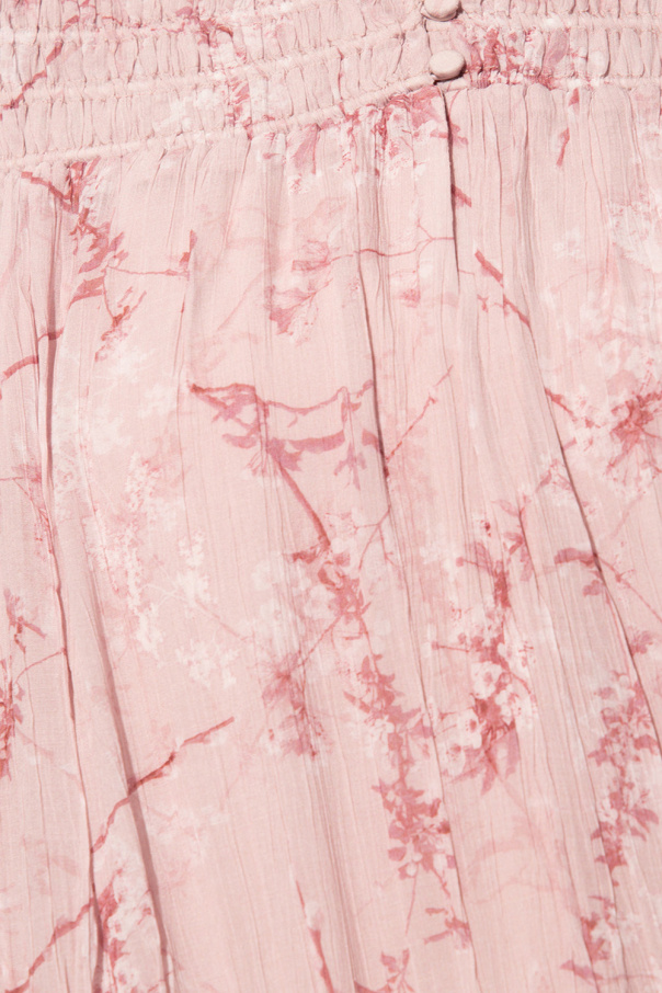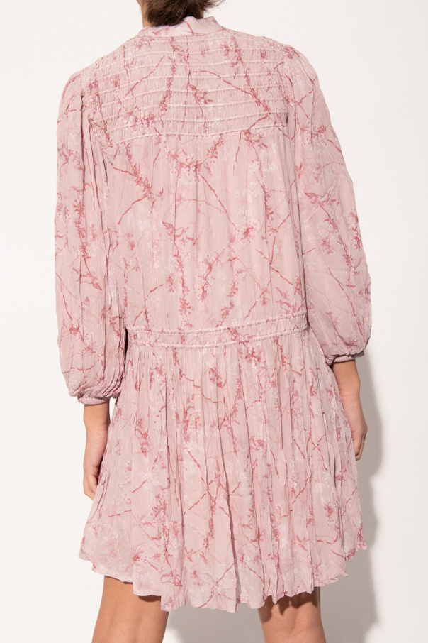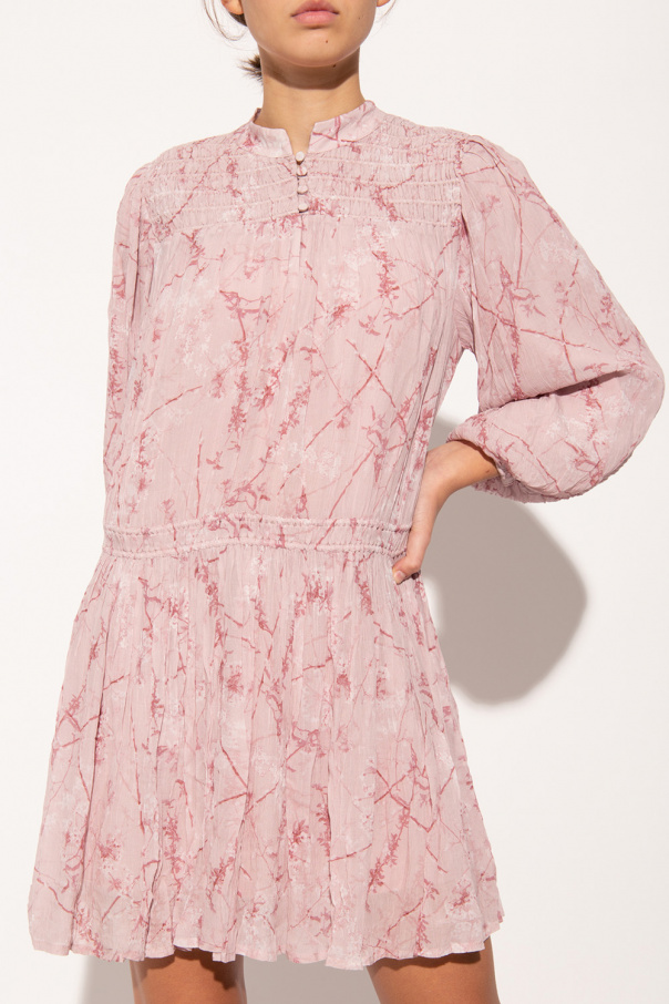 Pink ‘Isobella’ dress from AllSaints. Embellished with a floral print, this style features a standing collar with button closures, decorative gathers and blouson puff sleeves with elasticated cuffs.