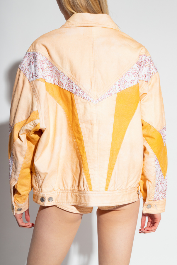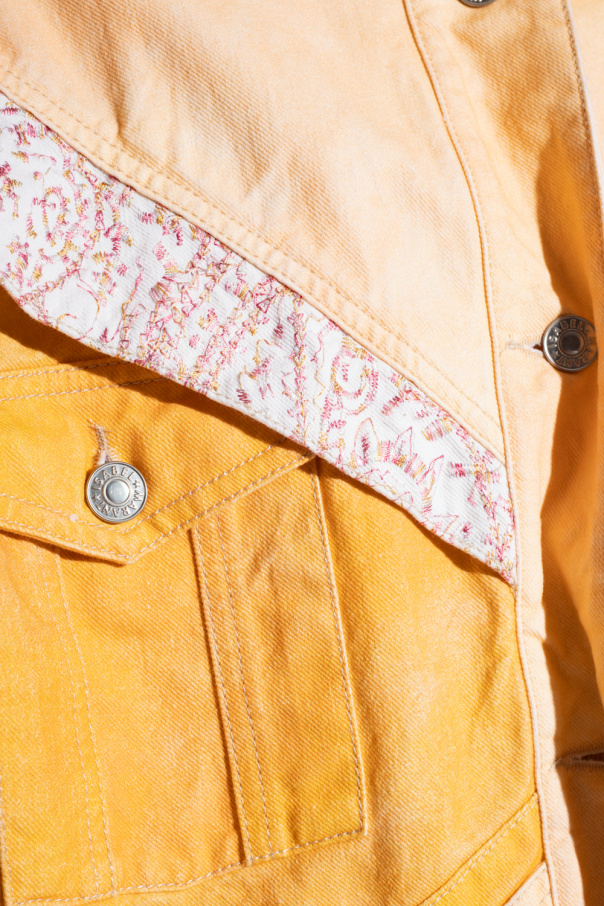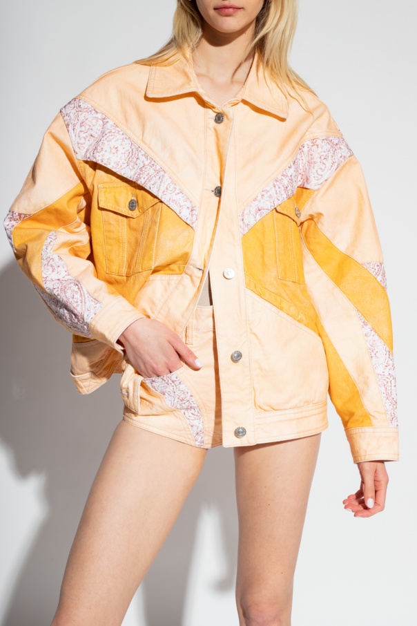 Light orange ‘Nisao’ denim jacket from Isabel Marant. Cut with an oversize silhouette, this style showcases patchwork patches with white and pink blossom embroidery, button fastenings, two slip pockets, two flapped button pockets and long sleeves with button cuffs.