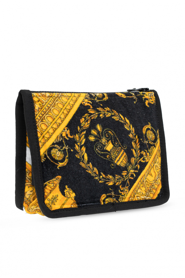 White, black and orange wash bag from Versace Home. Illustrated with the signature Barocco print with an accompanying motif of Medusa, this item features a zip fastening and one internal compartment.