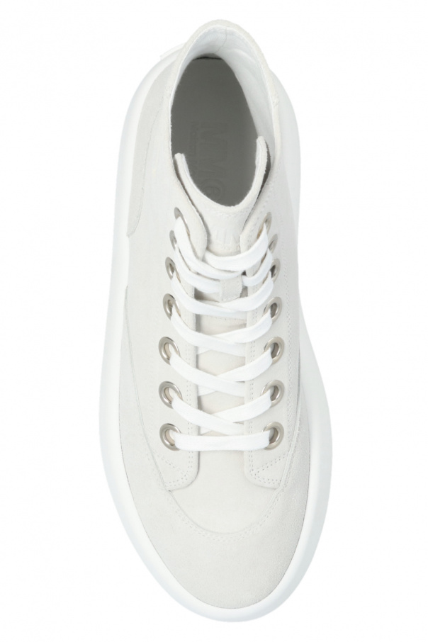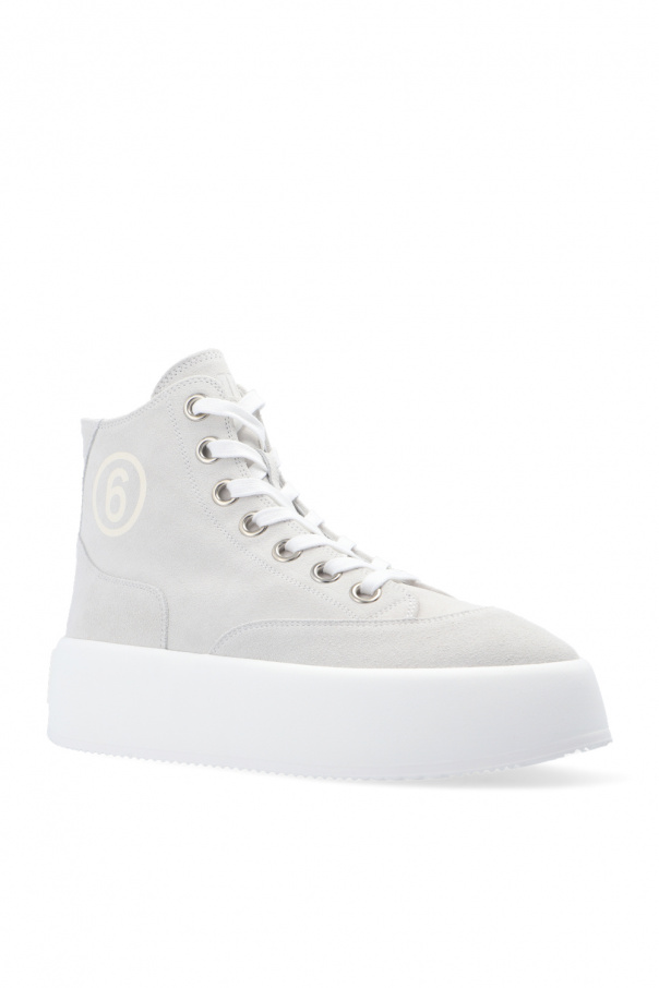 Light grey platform boots from MM6 Maison Margiela. Made of suede, this lace-up pair features a cream logo print, raised logo at the back and white rubber sole.
