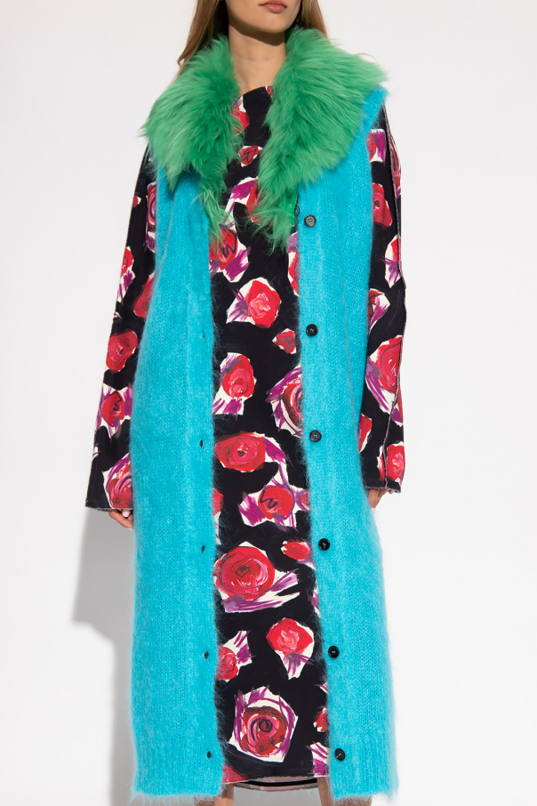 Blue vest from Marni. Made from a mohair blend with a long fit, this style features a V-neckline with a detachable green fur collar and elasticized trims on the edges.