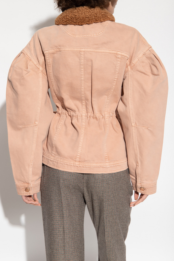Blush pink ‘The Odette’ denim jacket from Ulla Johnson. Fastened with buttons, this garment features brown sheep fur collar, two slip pockets, two buttoned flap pockets and long puff sleeves with buttoned cuffs.