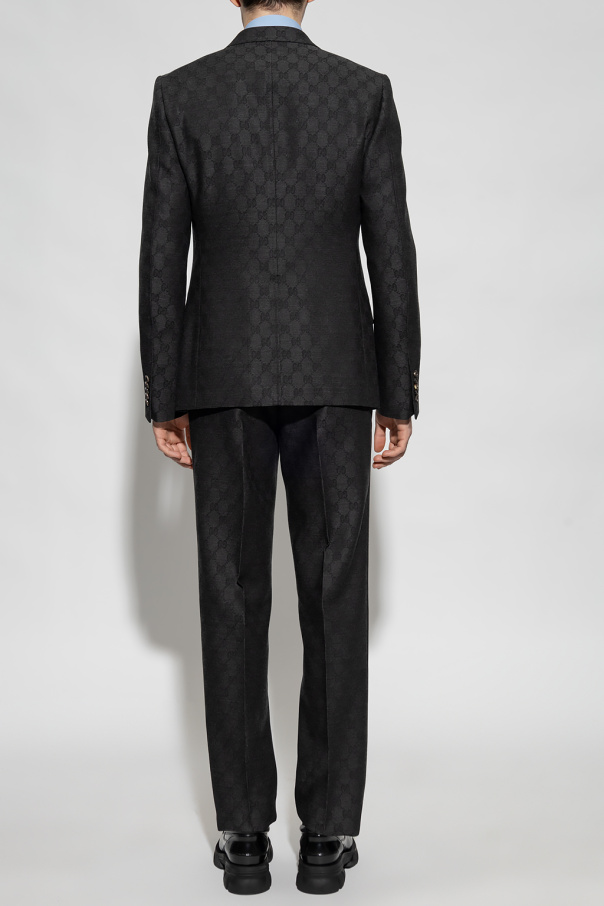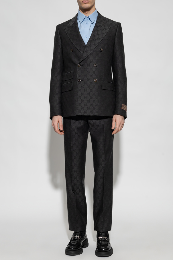 Grey suit from Gucci. Made of wool. The double-breasted blazer features peak lapels, three flap pockets, one slip pocket and double rear vent. The pleat-front trousers feature a zip and hook fastening, two slip pockets, two buttoned pockets and straight legs.