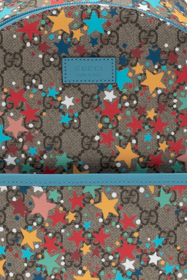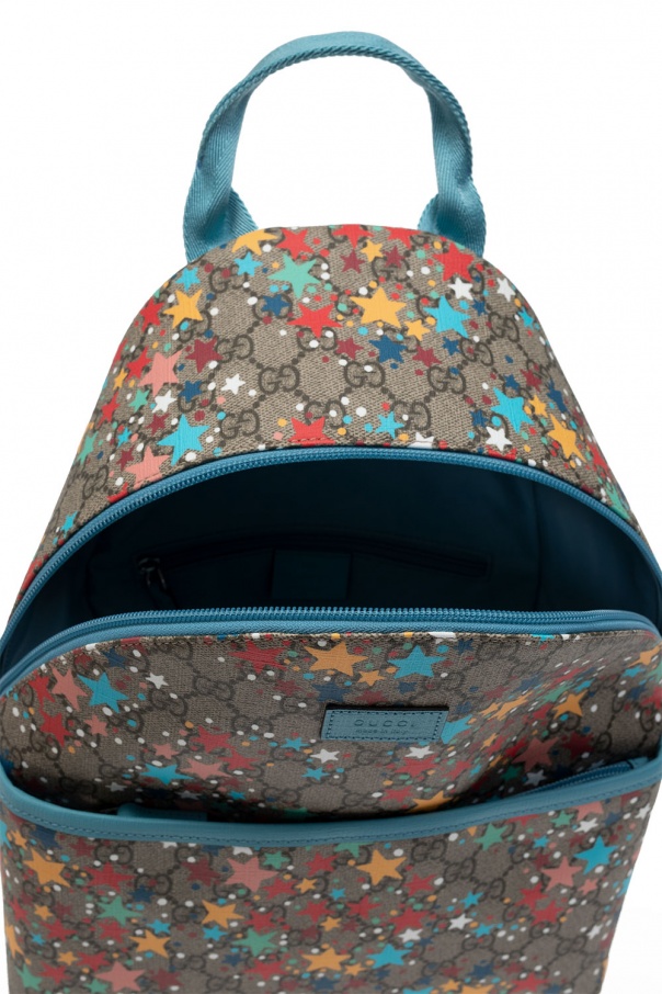 Beige and blue backpack from Gucci Kids. Made of GG Supreme canvas. It features a colorful star print, front zip pocket, half-round handle, adjustable shoulder straps decorated with navy and red Web stripes, silver-tone metal hardware, blue lining and one internal compartment with one zip pocket.