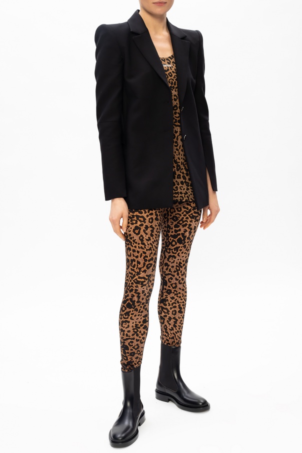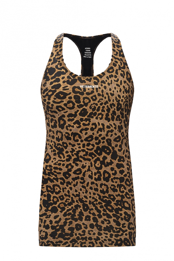 Brown and black slip dress from VETEMENTS. Illustrated with leopard print with an accompanying white logo, this sleeveless style is complete with a cut-out back.