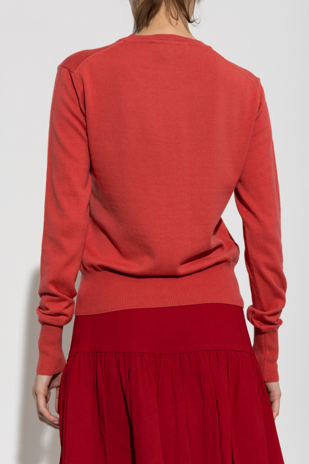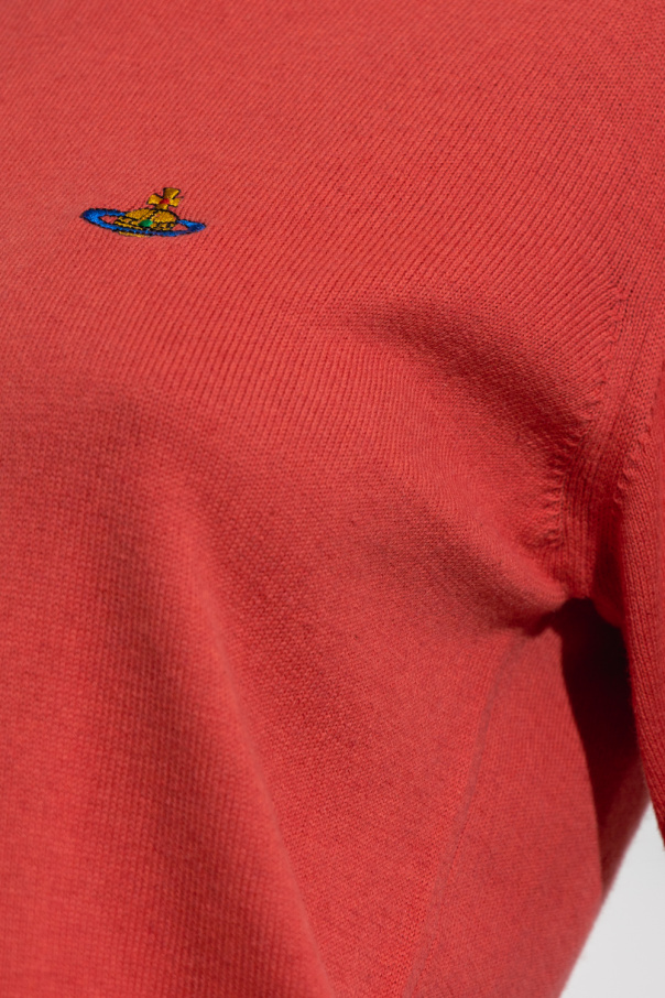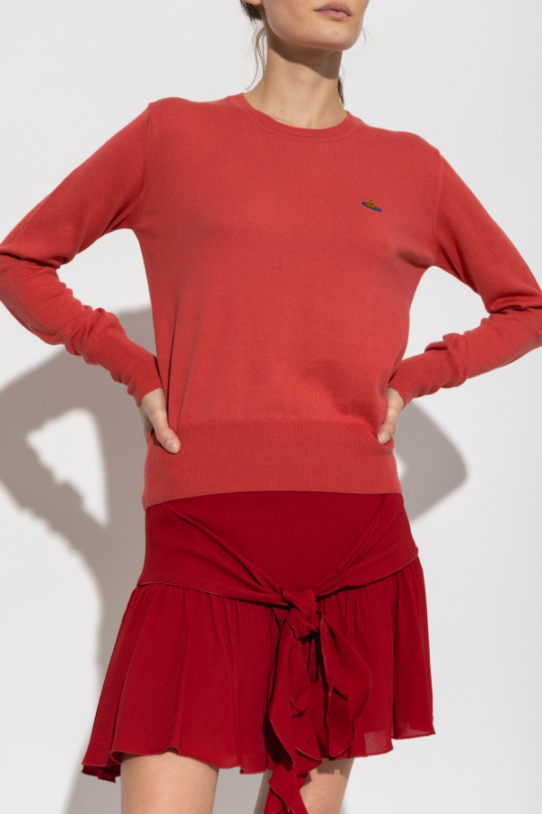 Red crewneck sweater from Vivienne Westwood. Made of a cotton and cashmere blend, this long sleeve design features a multicolored logo embroidery and ribbed trims.