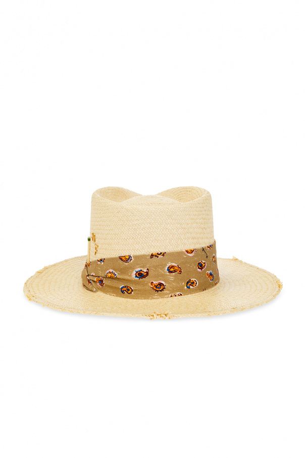 Light beige ‘Windward’ hat from Nick Fouquet. Made from straw, this item showcases a colourful paisley headband and the brand's signature matchstick and a logo plaque on the side.