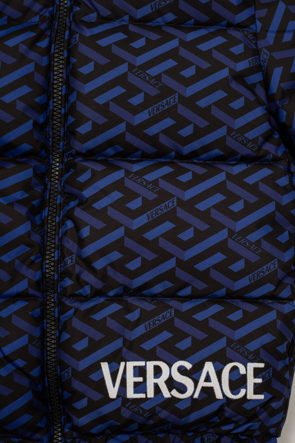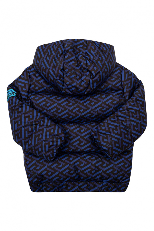 Navy and black quilted down jacket form Versace Kid. Fastened with a zip, this garment features La Greca pattern, white logo embroidery, detachable hood and long sleeves with elasticated cuffs.