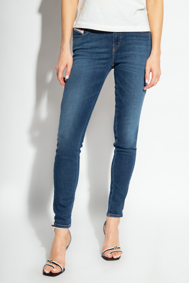 Navy ‘2017 SLANDY L.32’ jeans from Diesel. Fastened with a button and zip, this tapered pair is complete with logo patches and five slip pockets.