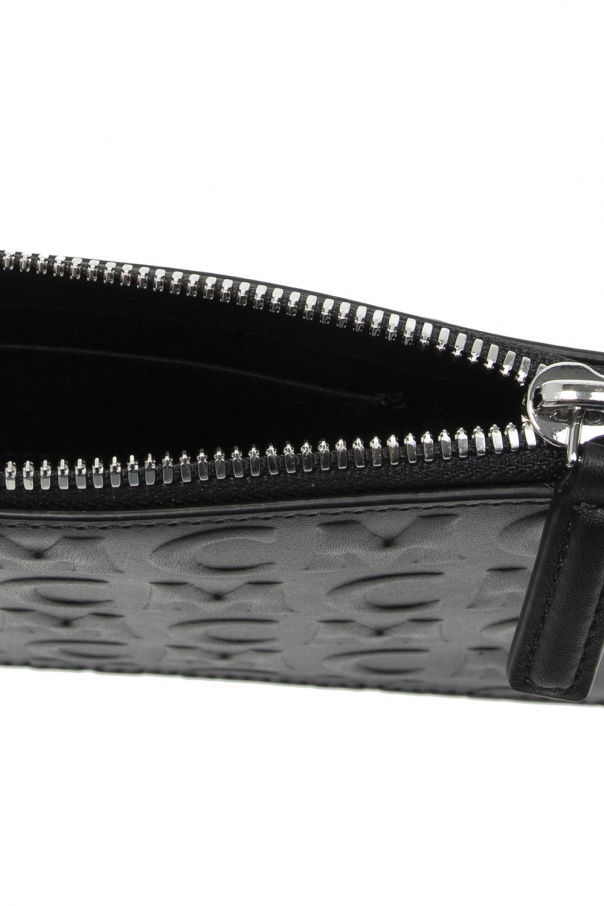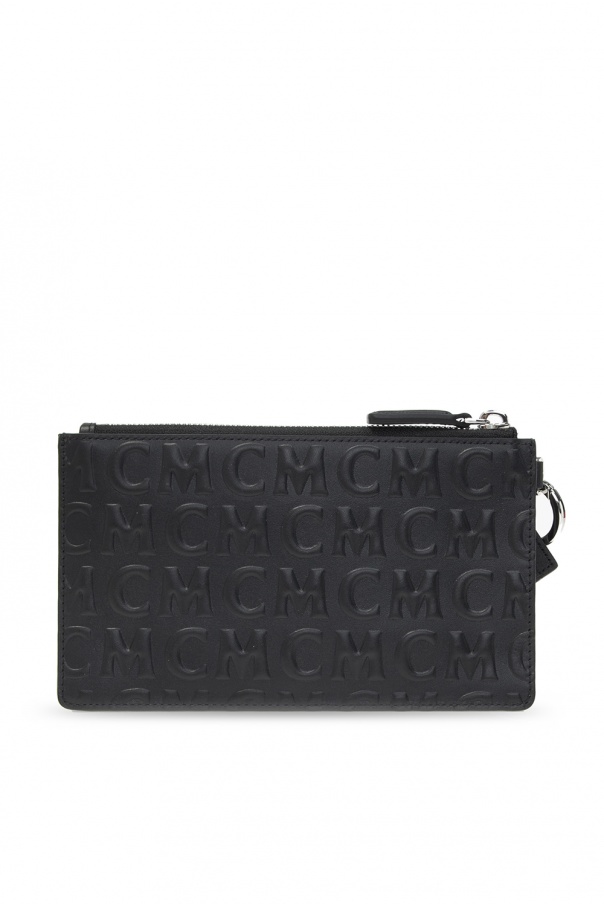 Black pouch from MCM. Fastened with a zip, this design features a raised logo detail, detachable wrist strap and card holder with three card slots, silver-tone metal hardware and one internal compartment with one card slot.