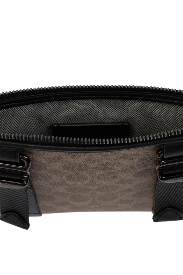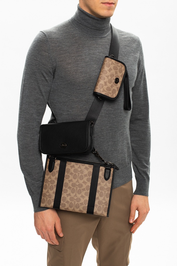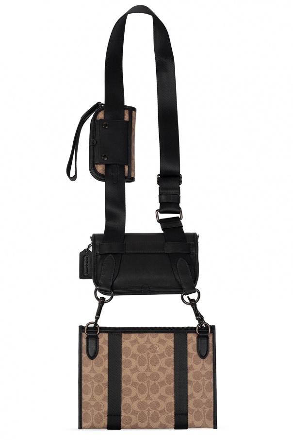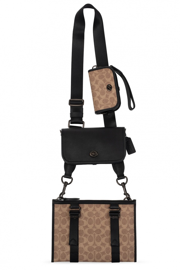Set of three belt bags from Coach. The set includes: a beige, cream and black bag made of canvas with leather trims, zip fastening, logo pattern and one internal compartment; a black leather bag with a decorative closure, one internal compartment and one zip pocket; a beige, cream and black bag with a decorative closure, logo print, one internal compartment and a detachable wrist strap.