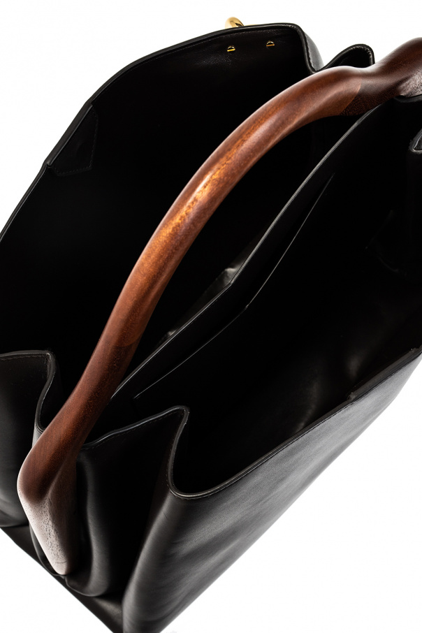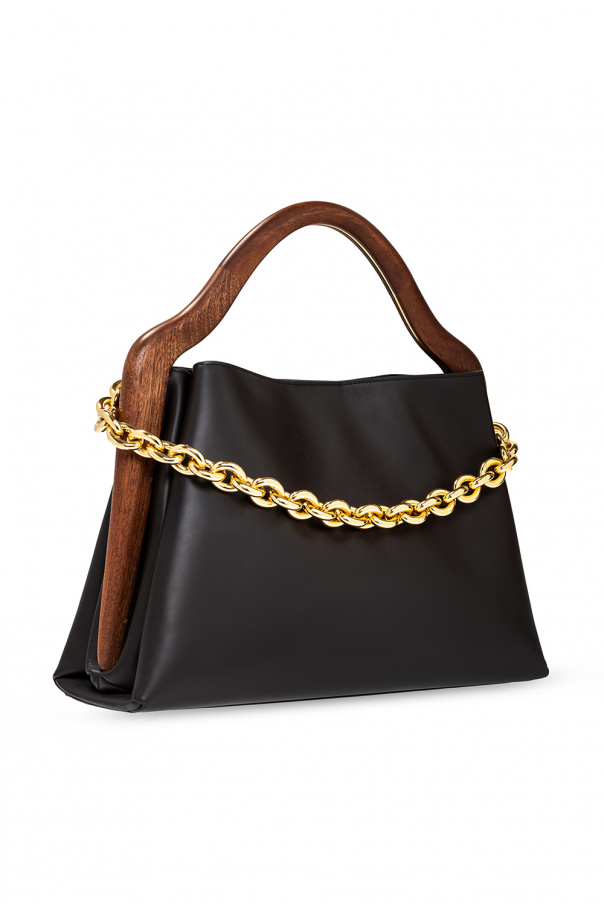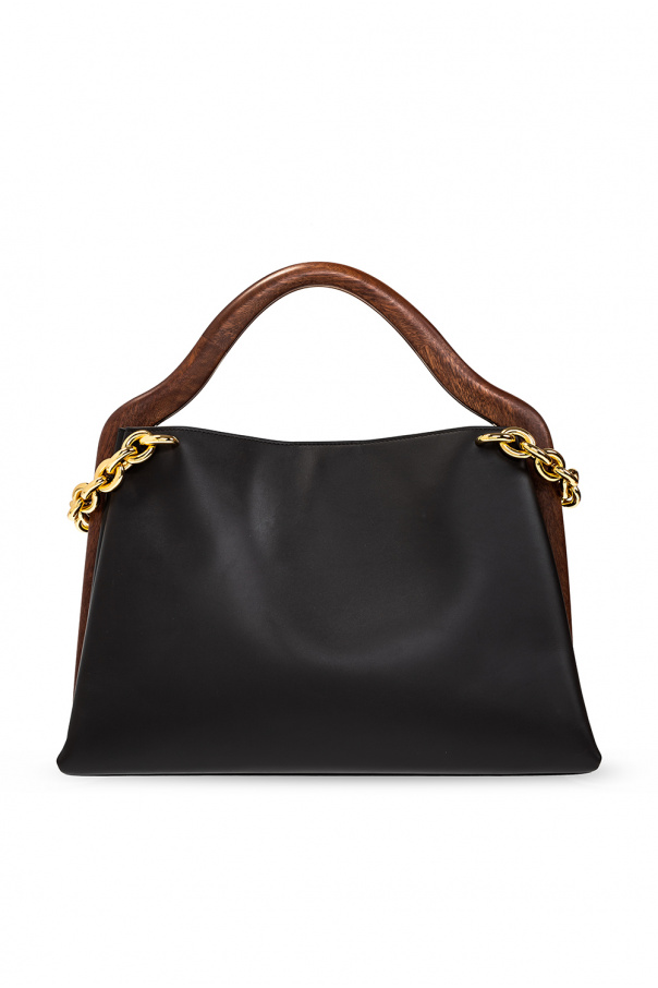 Brown and black ‘Mount’ hand bag from Bottega Veneta. Made of calf leather, this design features a magnetic closure, decorative wood handle, half-round chain handle, gold-tone metal hardware and two internal compartments with one slip pocket.