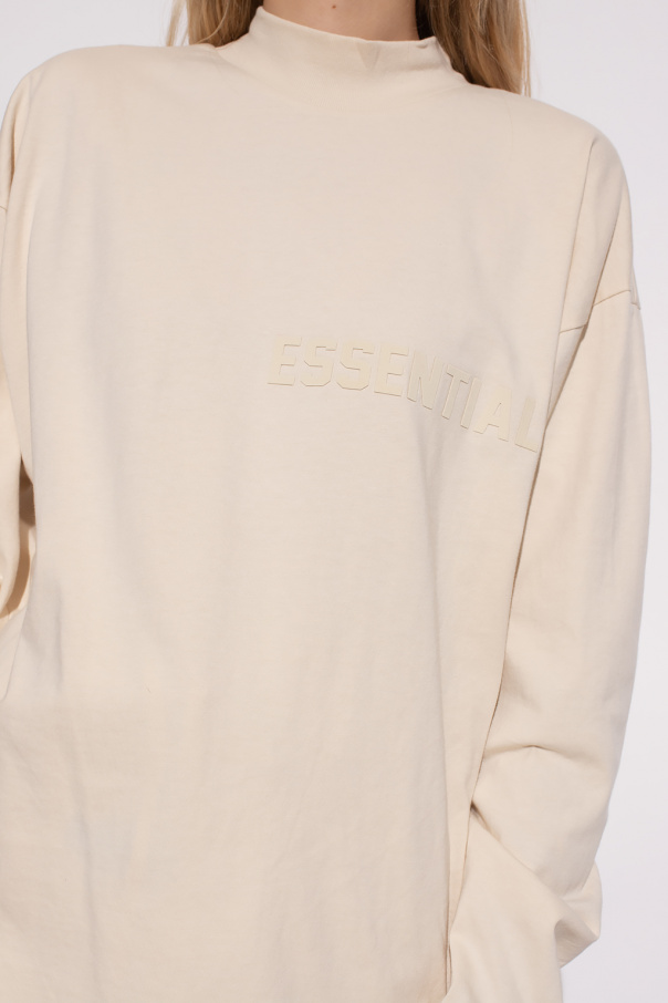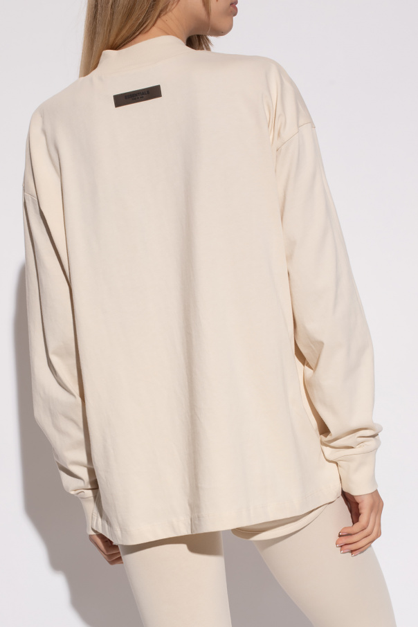 Cream crewneck T-shirt with long sleeves from Fear Of God Essentials. Made from cotton, this style features a logo pattern and an elasticated collar and cuffs.