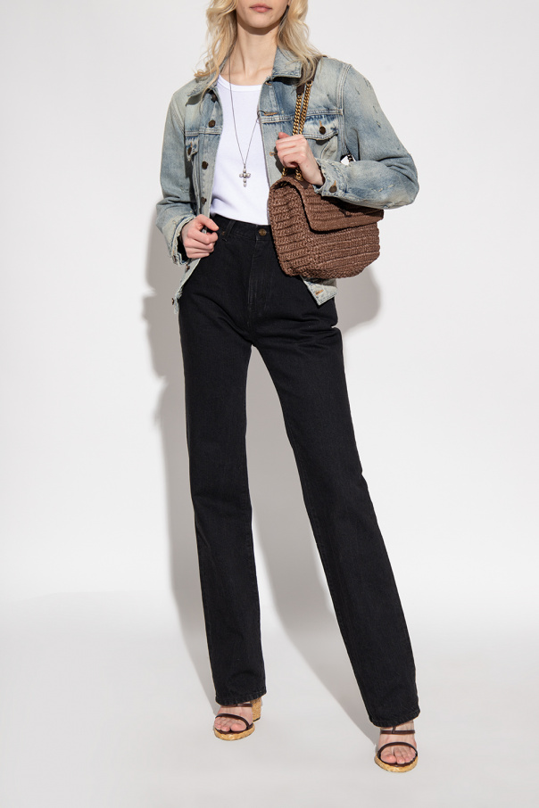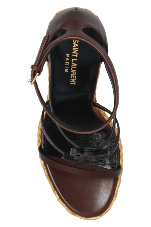 Brown ‘Cassandra’ wedge sandals from Saint Laurent. Crafted from calf leather, this pair is complete with buckled ankle straps, logo appliqué as well as a beige and brown sole made of leather and jute.