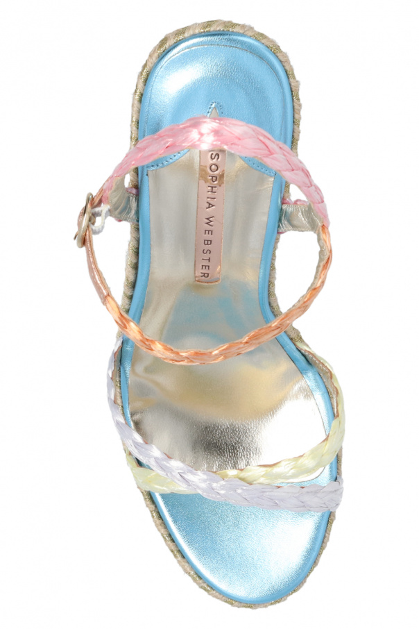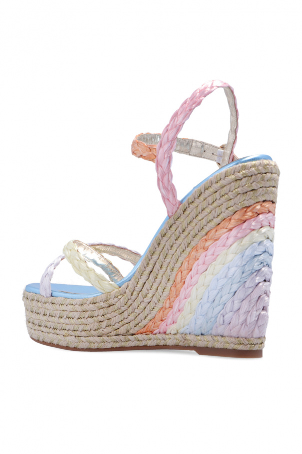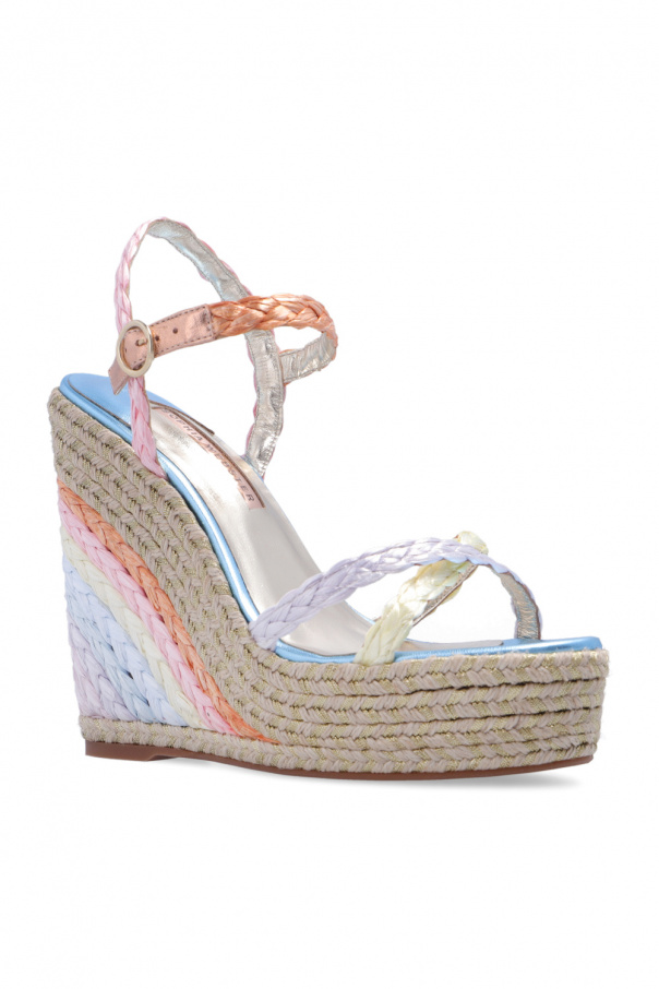 Multicoloured ‘Iness’ wedge sandals from Sophia Webster. Made of fabric and inlaid with gold-tone lurex thread, this model features a buckle strap fastening at the ankle and a brown rubber sole with a colourful jute overlay with a rainbow motif.
