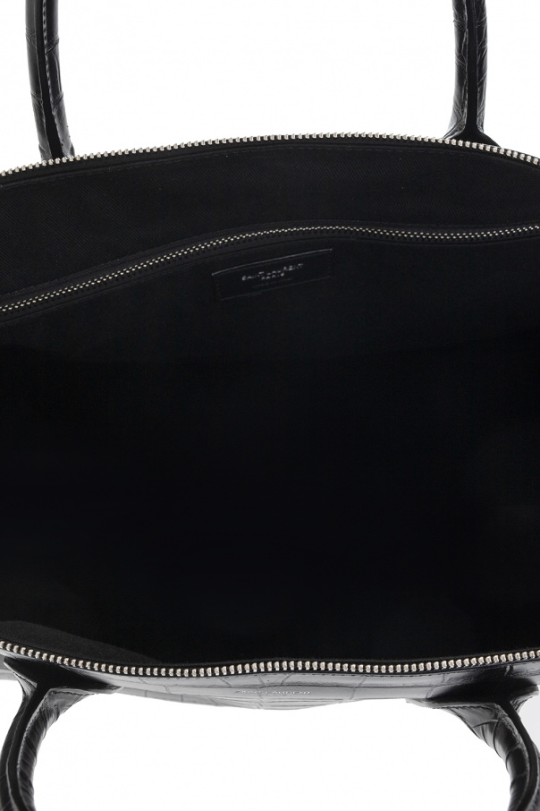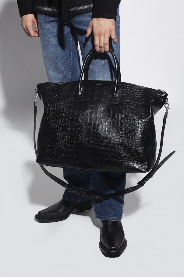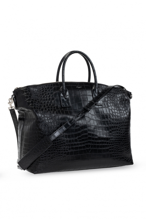 Black ‘Giant Bowling’ holdall bag from Saint Laurent. Crafted from calf leather with a crocodile skin effect, this model fastens with a two-way zip and is decorated with an embossed logo. It is complete with two half-round handles, detachable and adjustable strap, silver-tone metal hardware and one internal compartment with one zip pocket.