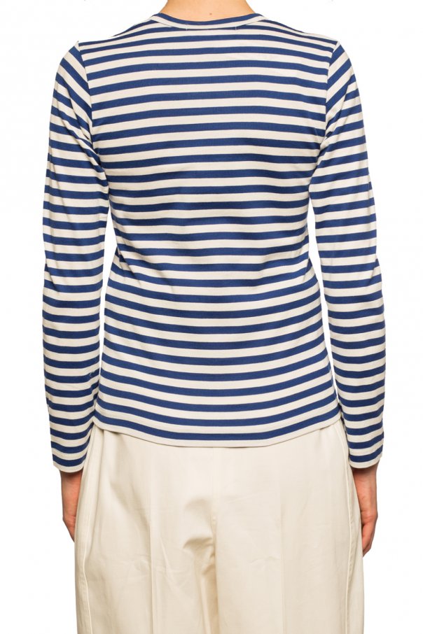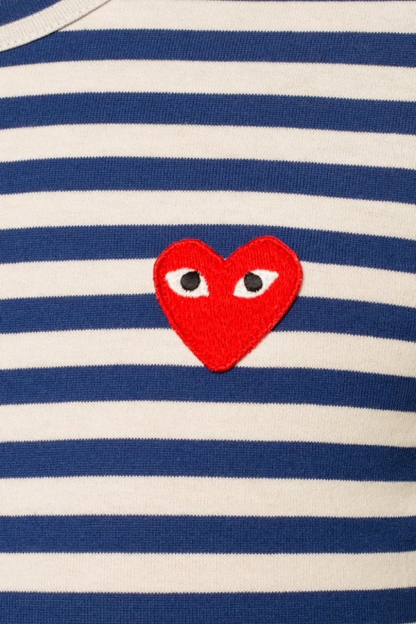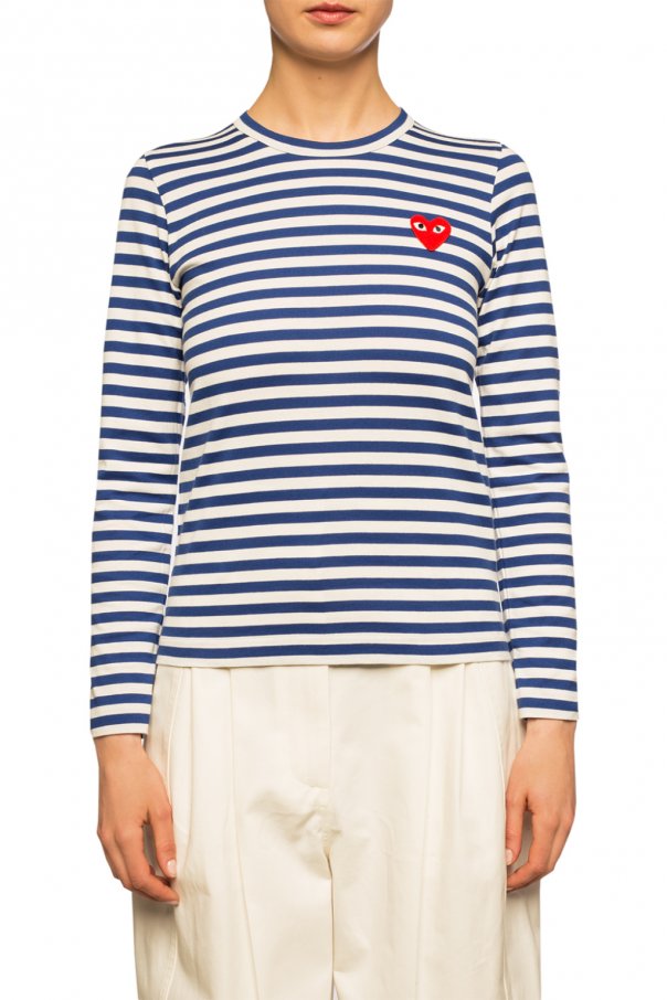 Blue and white cotton striped T-shirt with long sleeves from Comme des Garçons Play. Red, white and black heart-shaped patch with logo on the front.