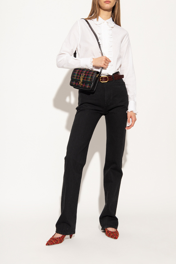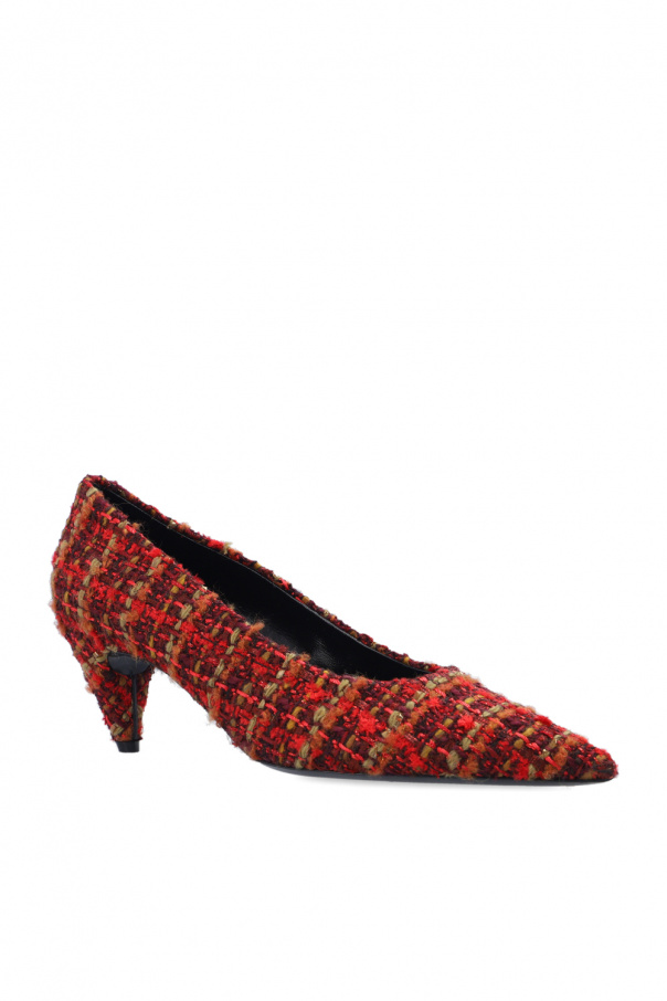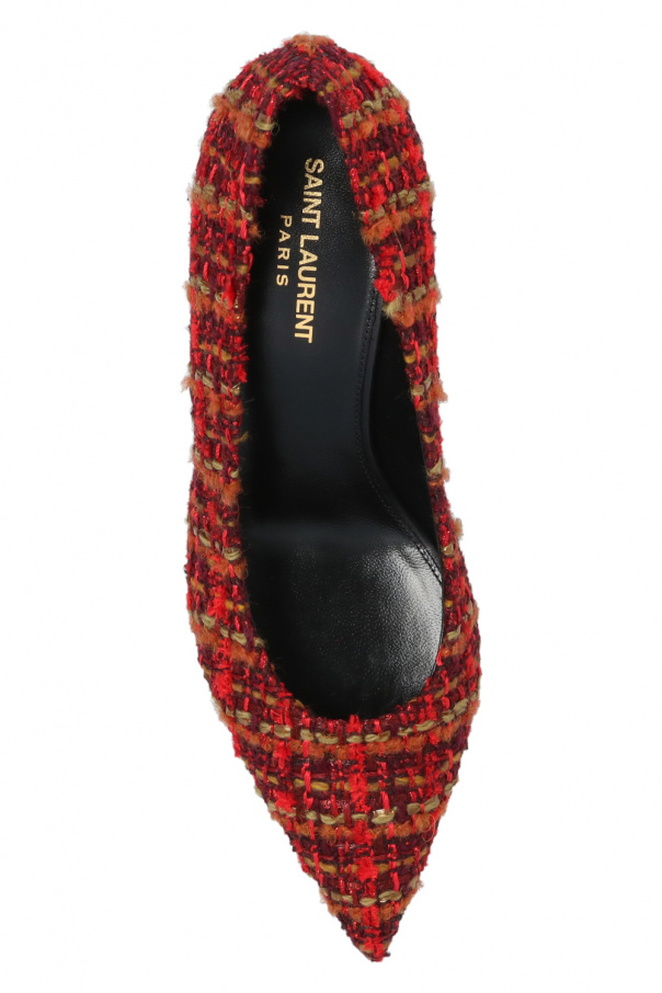 Red, yellow and black pumps from Saint Laurent. Made of tweed, this pair features a leather lining, check pattern, lurex thread, pointed toe and black leather sole.
