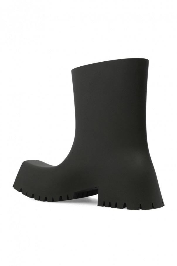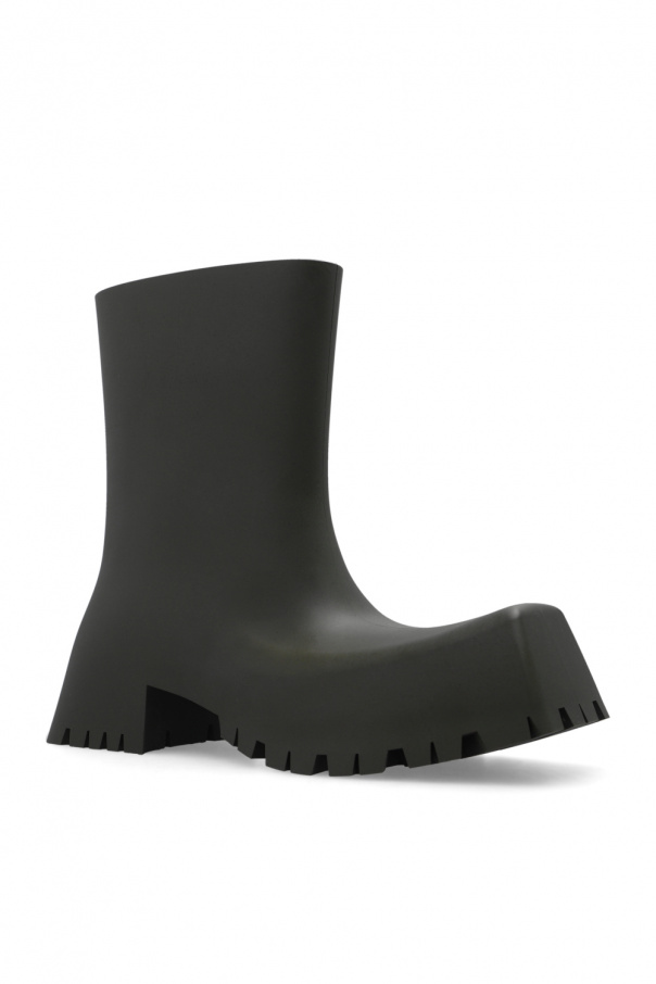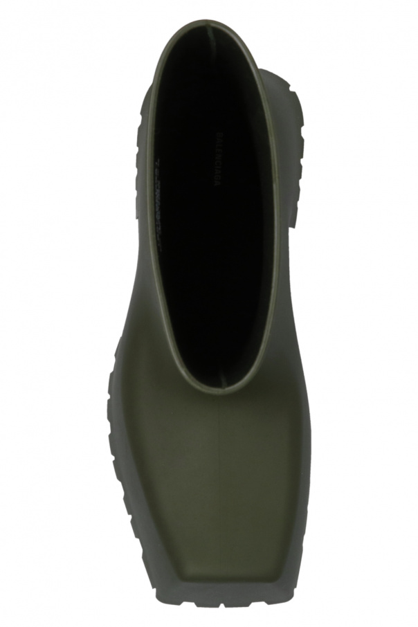Dark green ‘Trooper’ rain boots from Balenciaga. Made of rubber with a matte finish, this square toe design rests on a chunky black sole made of rubber.