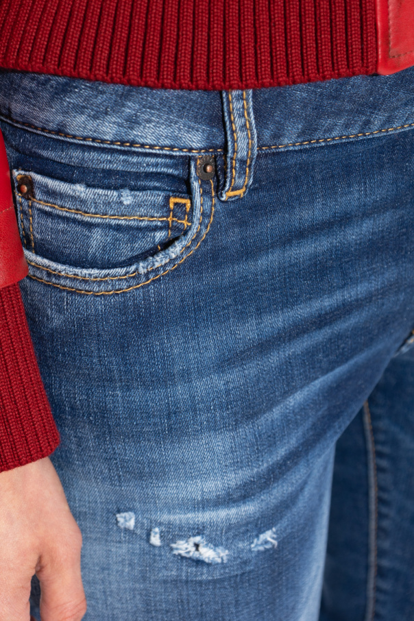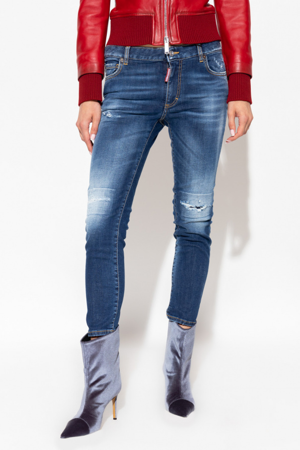 Navy blue ‘Twiggy’ jeans from Dsquared2. Falling with narrow, cropped legs, this pair features a zip fly with a button, classic five pockets, distressed details and a silver-tone logo plaque at the back.