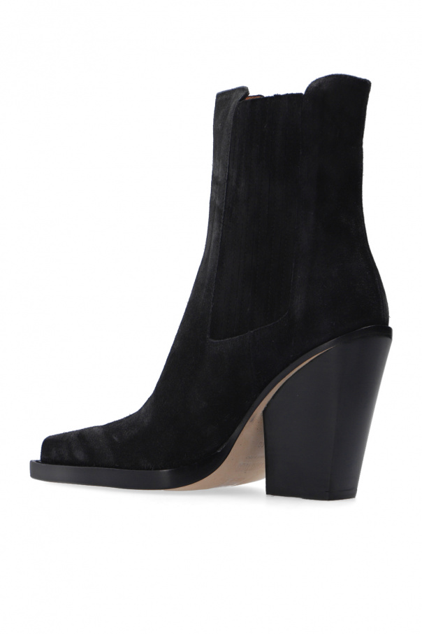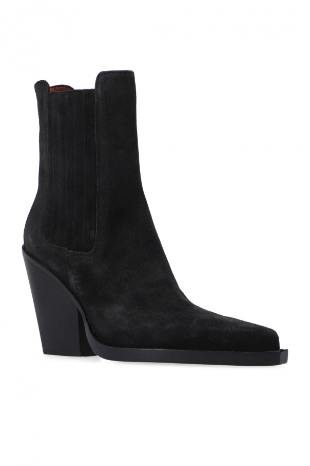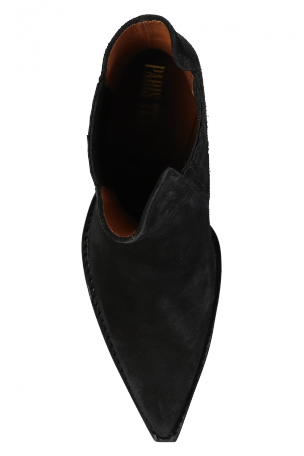 Black ‘Dallas’ heeled ankle boots from Paris Texas. Crafted from suede, this pointed toe pair rests on a beige leather sole.
