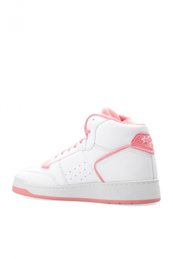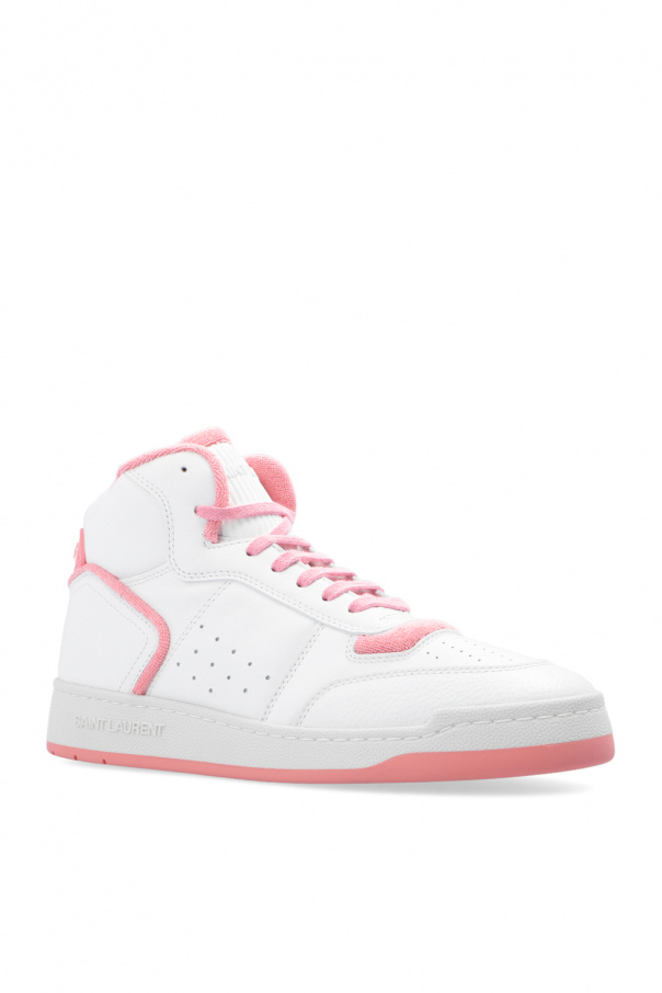 White and pink ‘SL 80’ high-top sneakers from Saint Laurent. Made of perforated, textured calf leather, this lace-up pair features pink terrycloth trims, swappable laces and rubber sole in white and pink with a heart pattern.