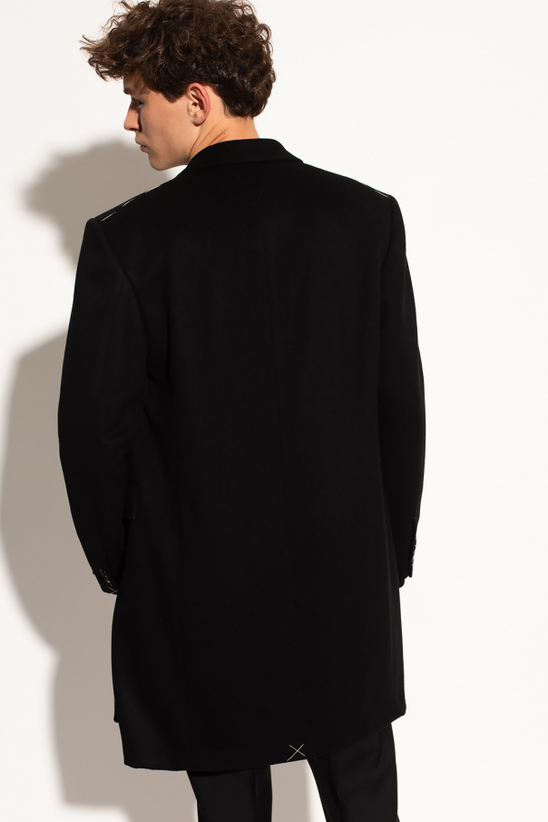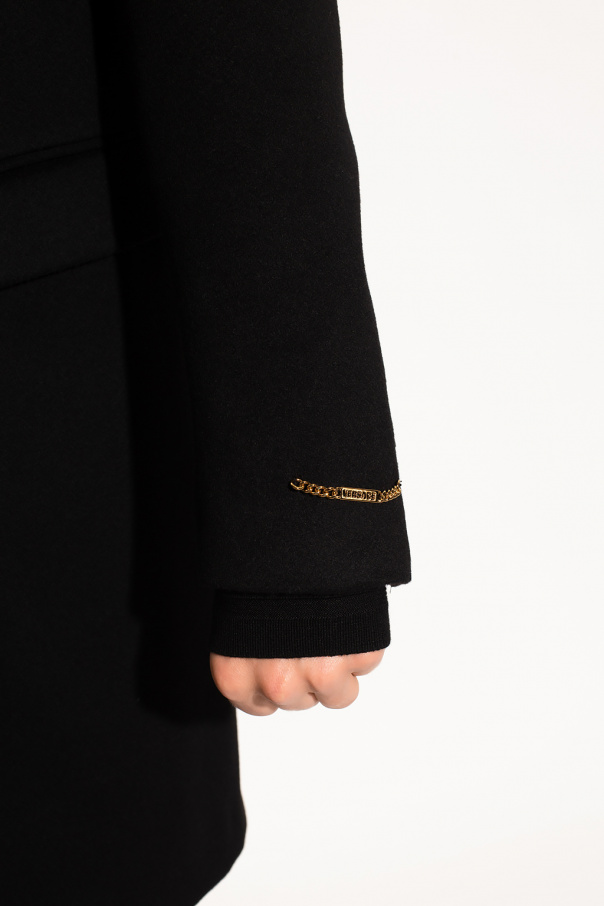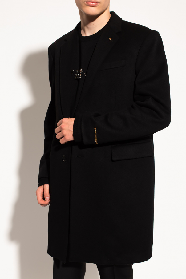Black coat from Versace. Made of wool, this garment features button fastenings, two flap pockets, one slip pocket, notch lapels with the label’s signature Medusa head motif, decorative stitching details at the shoulders, single rear vent and long sleeves with button cuffs.