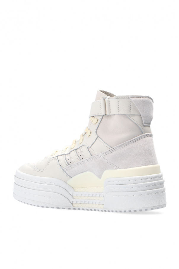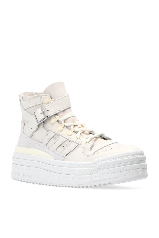 Cream ‘Triple Platforum Hi’ sneakers from ADIDAS Originals. Crafted from leather, this lace-up model sits on a beige and cream rubber sole and showcases a high-top silhouette, an additional strap fastening with a silver-tone buckle and perforated toe cap.