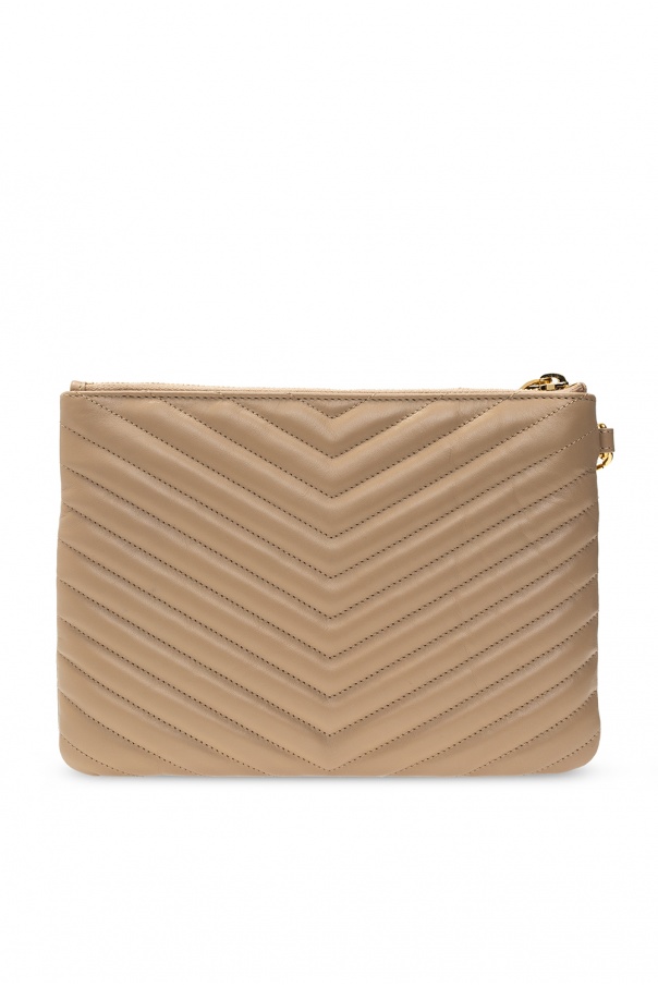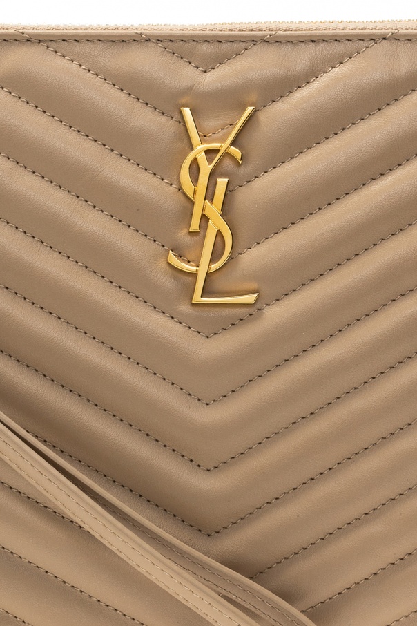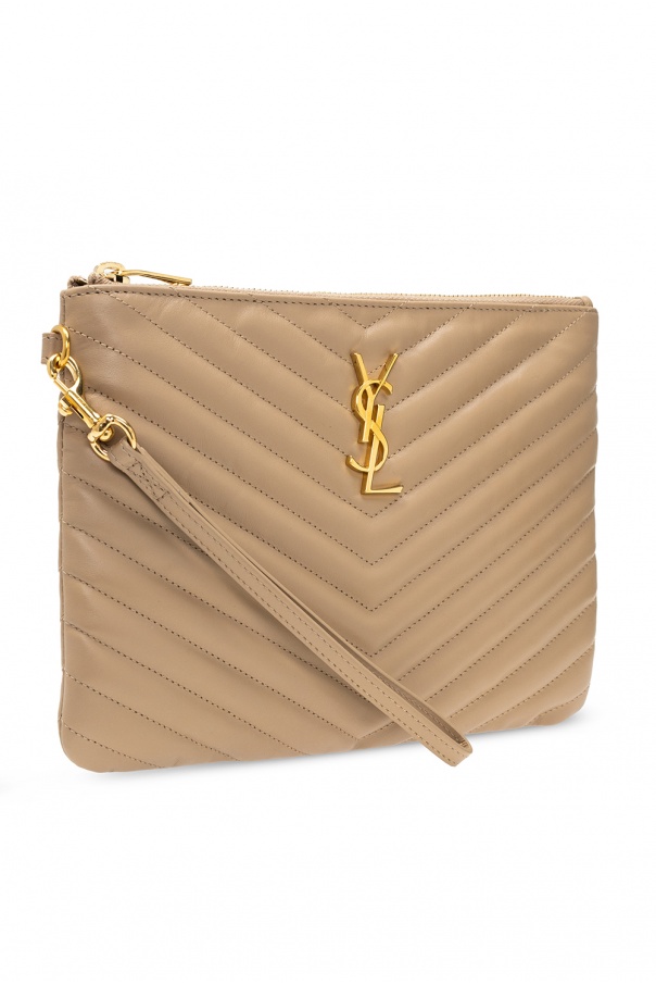 Beige 'Monogram' quilted clutch from Saint Laurent. Crafted from leather, this item fastens via a zip and features a metal logo on the front, a wrist strap on the side, gold-tone metal fittings and a black-clad interior with one compartment, two slip pockets and six card slots.