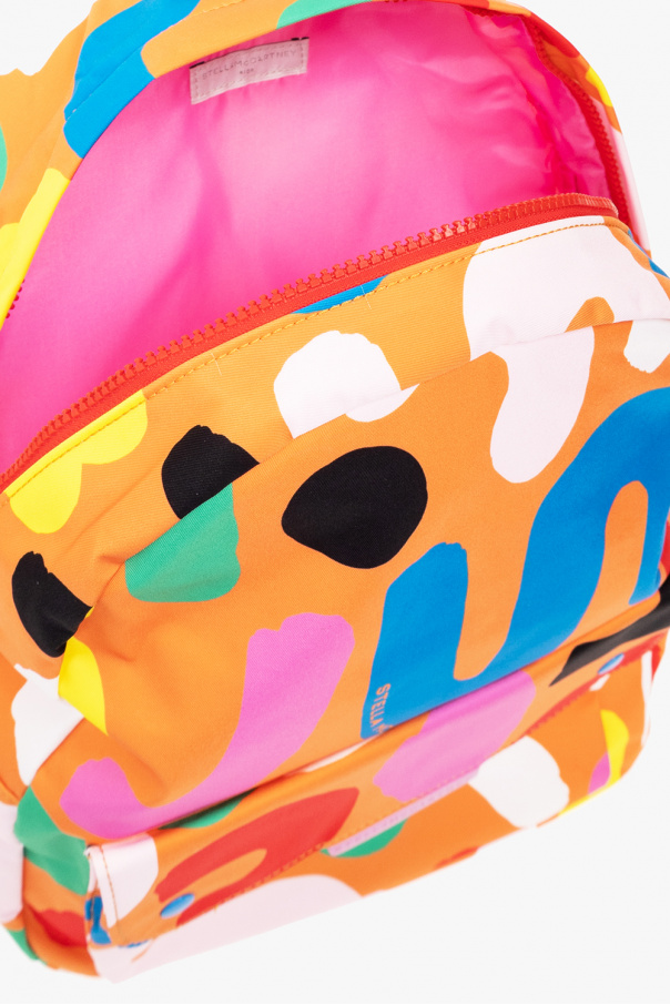 Orange backpack from Stella McCartney Kids. Crafted from recycled materials, this model feature a two-way zip, snap-fastened flap pocket, half-round handle, adjustable shoulder strap, adjustable shoulder straps and metal hardware in red and blue.