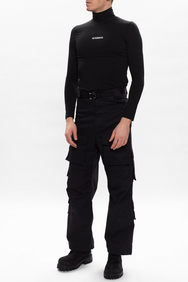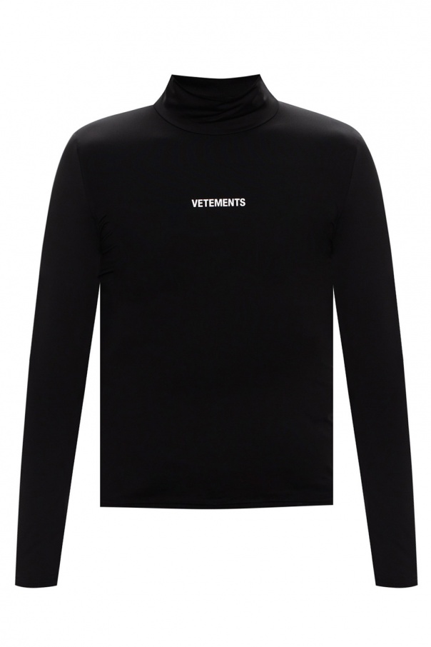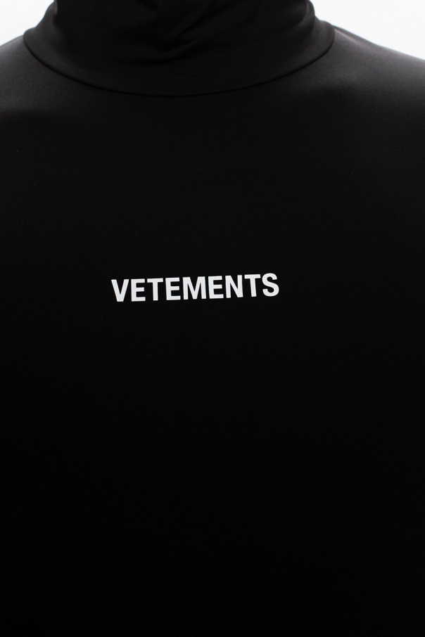 Black top with a band collar from VETEMENTS. The garment is decorated with a printed logo pattern in white.