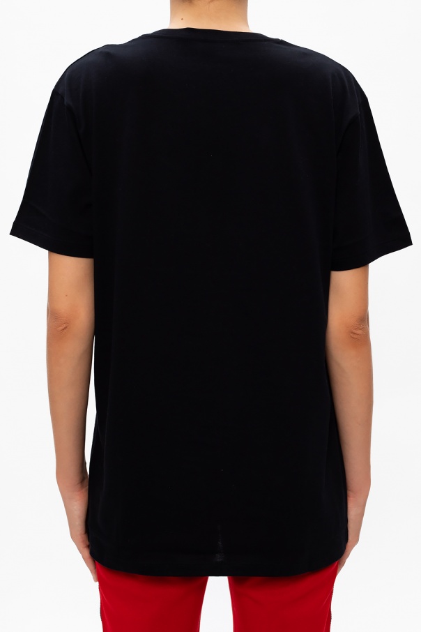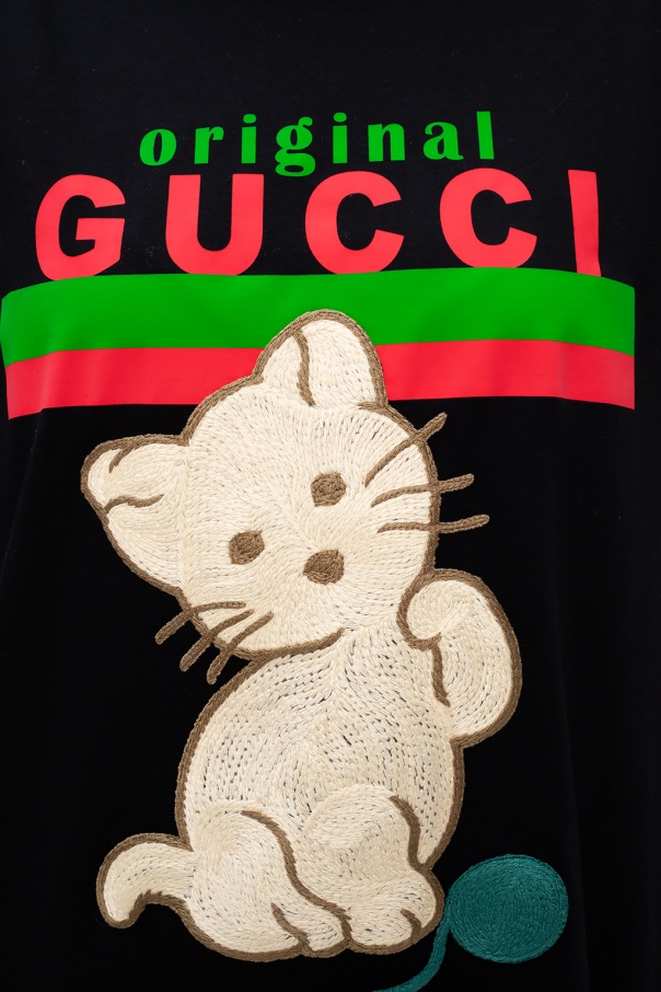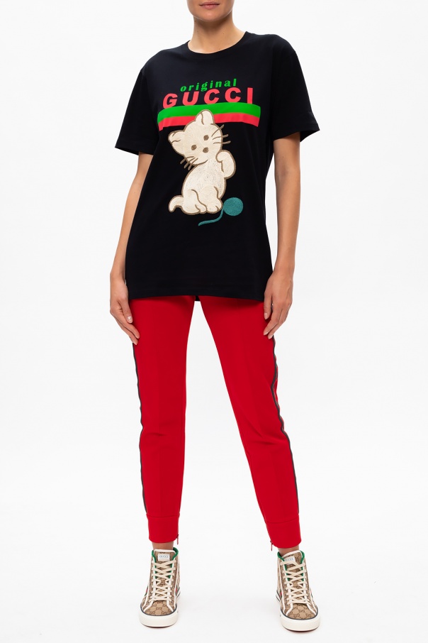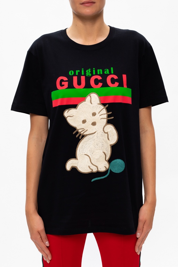 Black crewneck T-shirt from Gucci. Crafted from organic cotton, this oversize design features a green and red logo print and an embroidered animal motif.