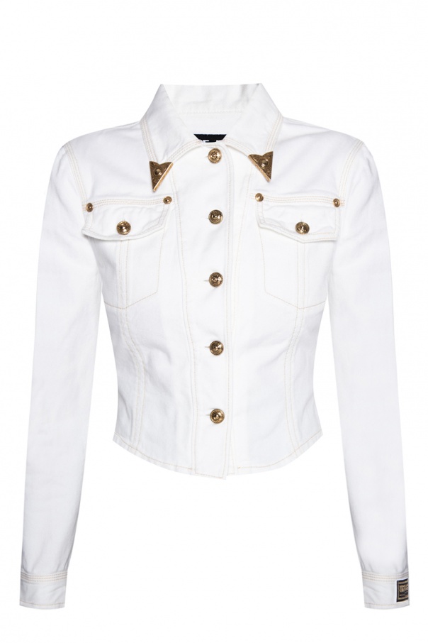 White denim jacket from Versace Jeans Couture. Flaunting embellishments on collar, this item is complete with logo-embossed gold-tone buttons, long sleeves, gold-tone topstitching and two flapped pockets with buttons.