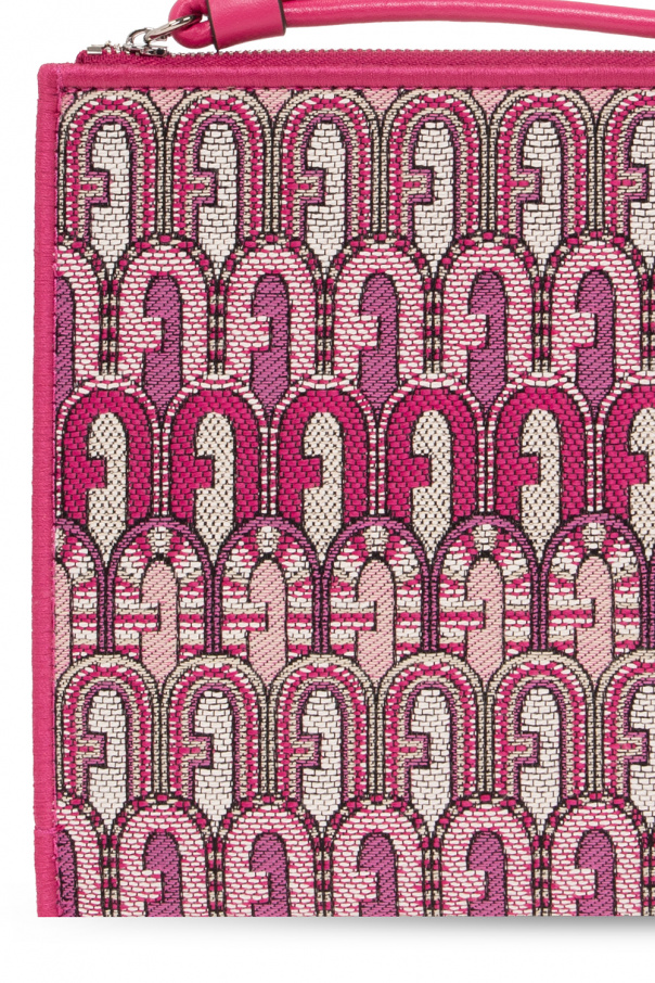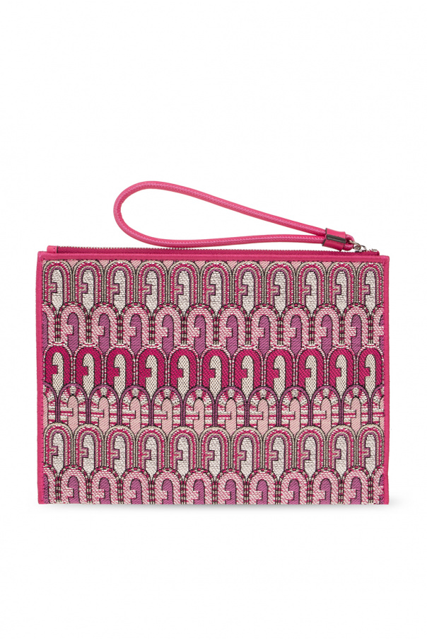 Pink and cream ‘Opportunity’ clutch from Furla. Crafted from canvas with a jacquard ethnic Arch logo, this design features a zip fastening with a wrist strap, silver-tone metal hardware and one internal compartment with a slip pocket.