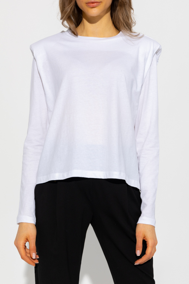 White ‘Mika’ crewneck T-shirt from AllSaints. Made of cotton, this style features long sleeves, padded shoulders, an elasticated collar and a vertical logo print at the back.