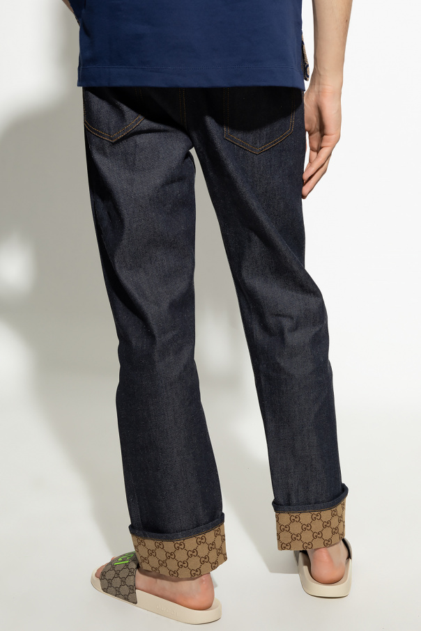 Navy jeans from Gucci. This pair falls down with straight legs and is complete with a zip and button closure, black logo patch at the back, five slip pockets and turn up cuffs with a beige and brown inserts embroidered with a GG pattern.
