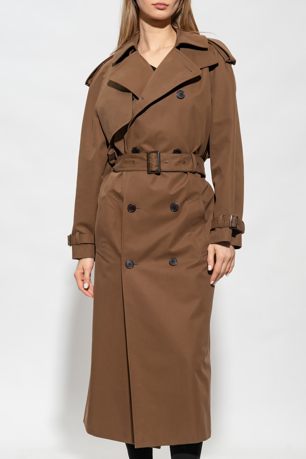 Brown trench coat from Saint Laurent. Crafted from cotton gabardine with a double-breasted silhouette, this style fastens with buttons and features a waist-cinching tie belt, a storm flap, shoulder epaulettes, long sleeves with cuff adjusters, two slip pockets as well as a single back vent.
