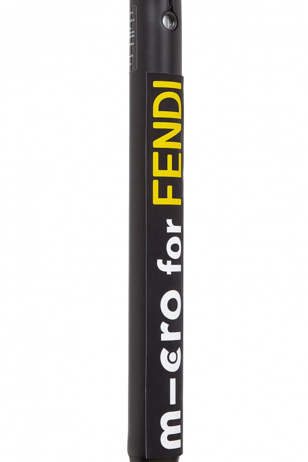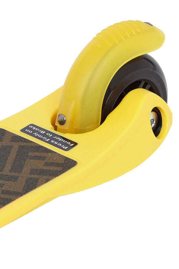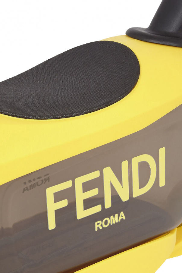 Yellow and black ‘Fendi-Micro’ three-wheel scooter from Fendi Kids. Designed for kids aged from 3 to 6, this model features a detachable and adjustable steering device, a removable seat with a storage container, an adjustable length of the handlebar and the monogram pattern throughout.