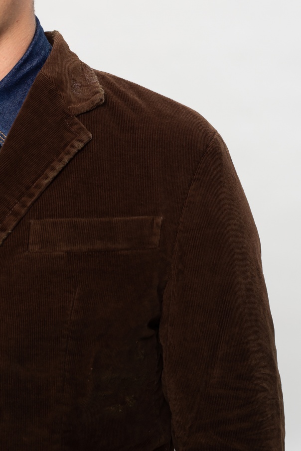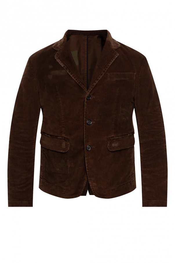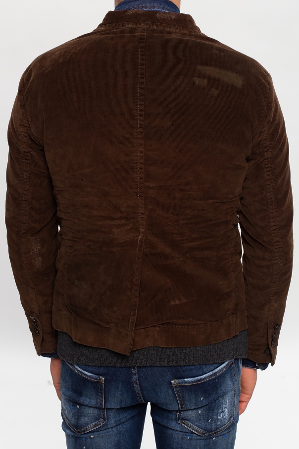 Brown blazer from Dsquared2. Crafted from corduroy cotton, this garment fastens via buttons and employs distinctive distressed details and exposed stitching details as well as long sleeves, three pockets on the front, including two flapped ones, and a single vent on the back.