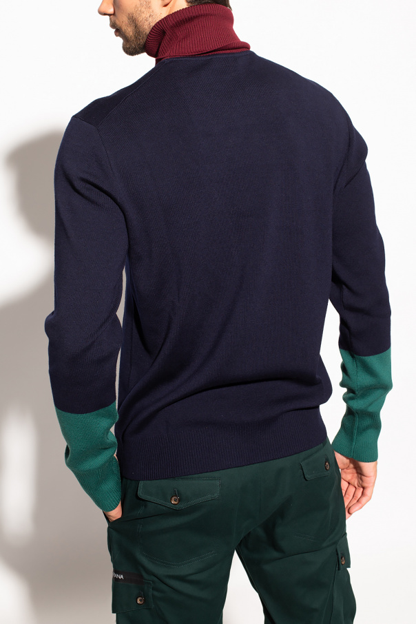 Navy blue, green and maroon turtleneck sweater from Dolce & Gabbana. Crafted from wool, this style showcases a snug collar, long sleeves and a colourful logo patch on the front.