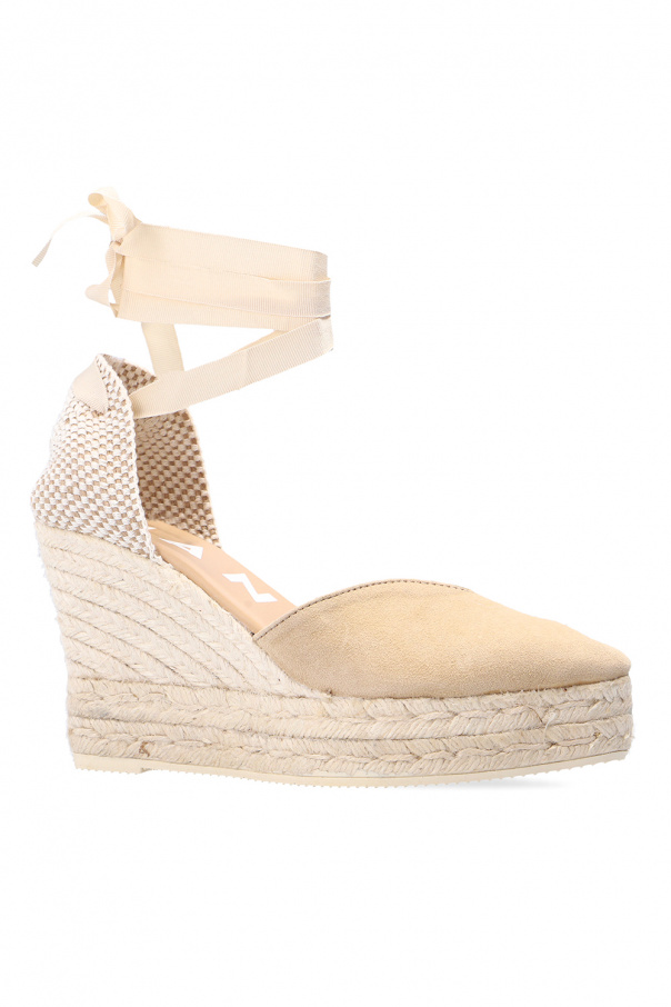 Beige ‘Hamptons’ wedge shoes from Manebi. Crafted from suede, this model features a cream rubber sole, a platform with a beige jute overlay and grosgrain ribbon ties at the ankle.