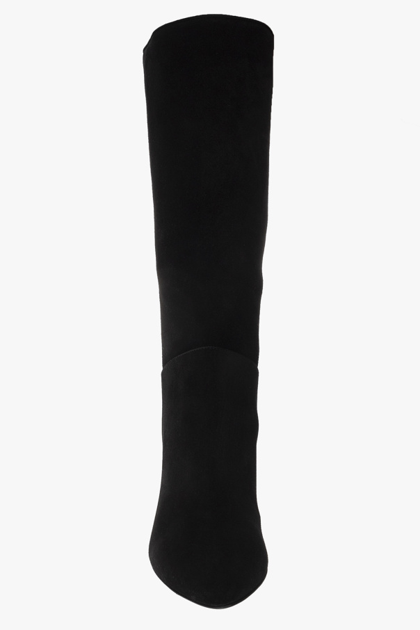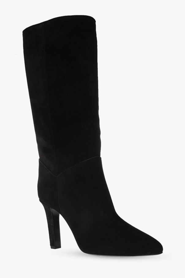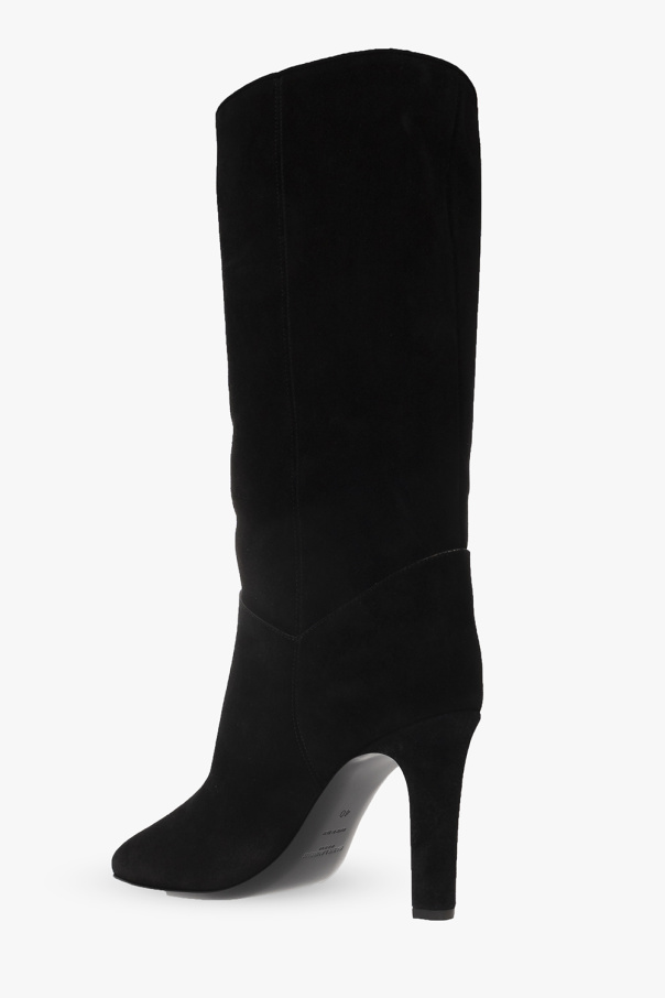 Black ‘Tracy’ heeled boots from Saint Laurent. Made of suede, this slip-on pair features an almond toe and black leather sole.