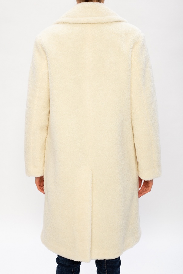 Cream double-breasted shearling coat from Burberry. Crafted from wool, this long sleeve design features two front slip pockets, a slit at the back and cotton lining decorated with the label’s iconic colorful check.