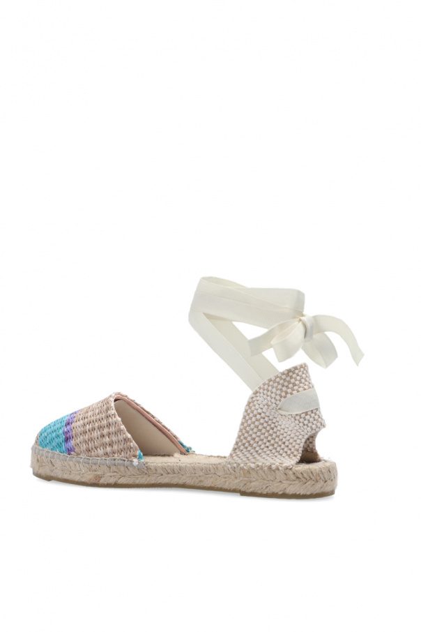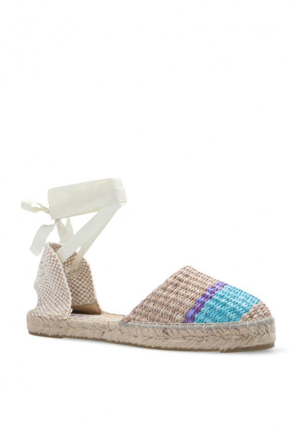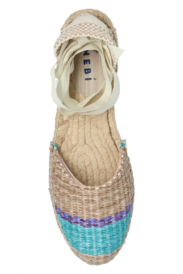 Beige, blue and purple ‘Valenciana’ espadrilles from Manebi. Made of raffia, this model features cut-out detailing, beige grosgrain ankle tie closures and a natural jute sole with a thin rubber layer in beige.