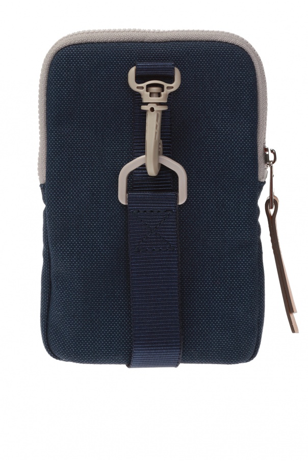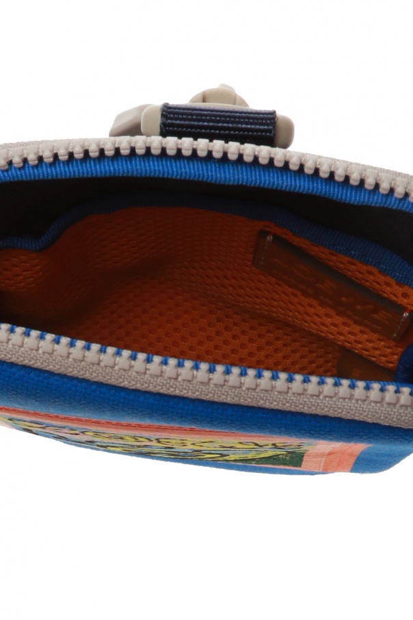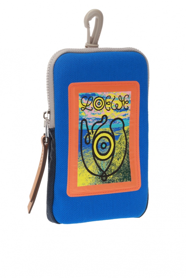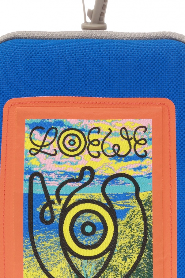Blue phone case from Loewe, ‘Eye/Loewe/Nature’ collection. Trimmed with calf leather. Zip fastening. Decorated with a colorful logo patch. Detachable neck strap. One compartment, slip pocket and 3 card slots inside.