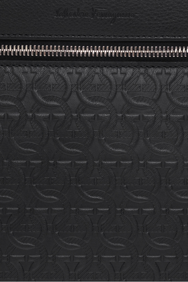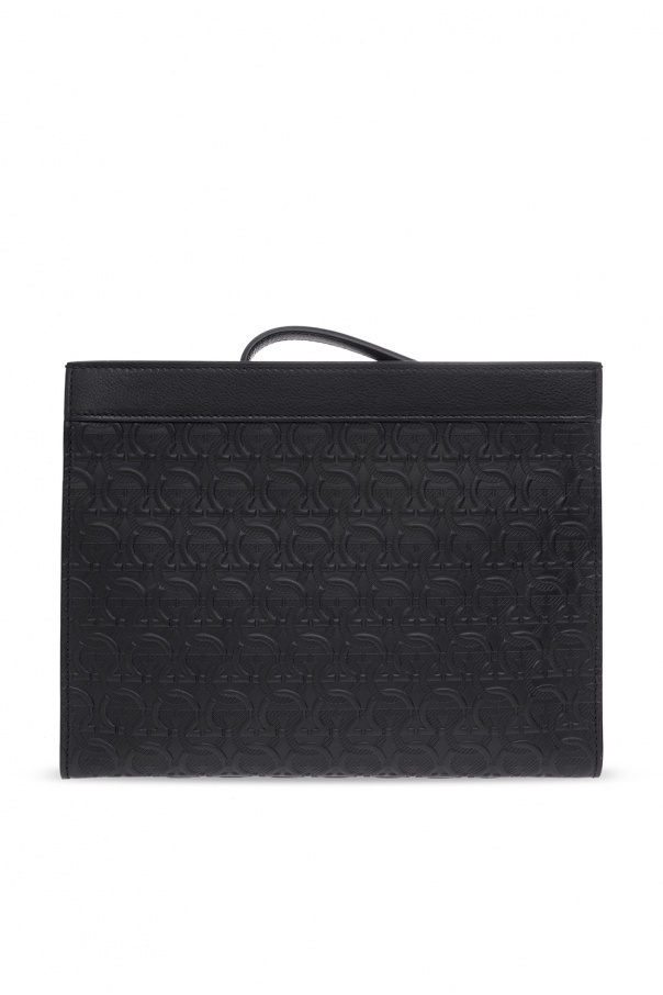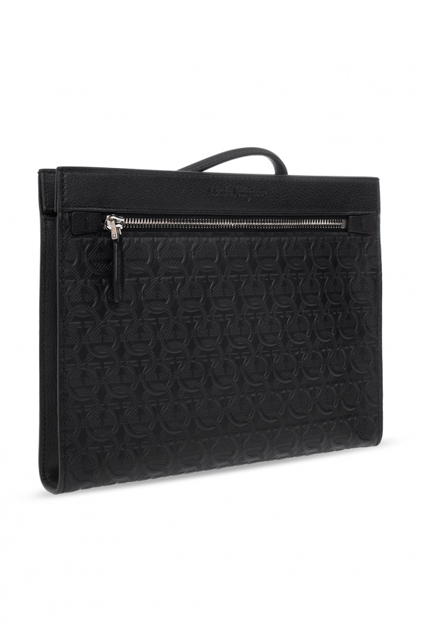 Black handbag from Salvatore Ferragamo. Crafted from calf leather with an embossed Gancini motif, this design features a zip fastening with a wrist strap, a zip pocket on the front and one internal compartment with a two slip pockets.