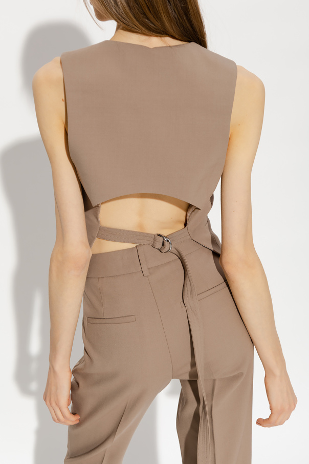 Brown vest from Helmut Lang. Made of wool, this style features button closures, two slip pockets and a deep vent accompanied by a buckle belt at the back.